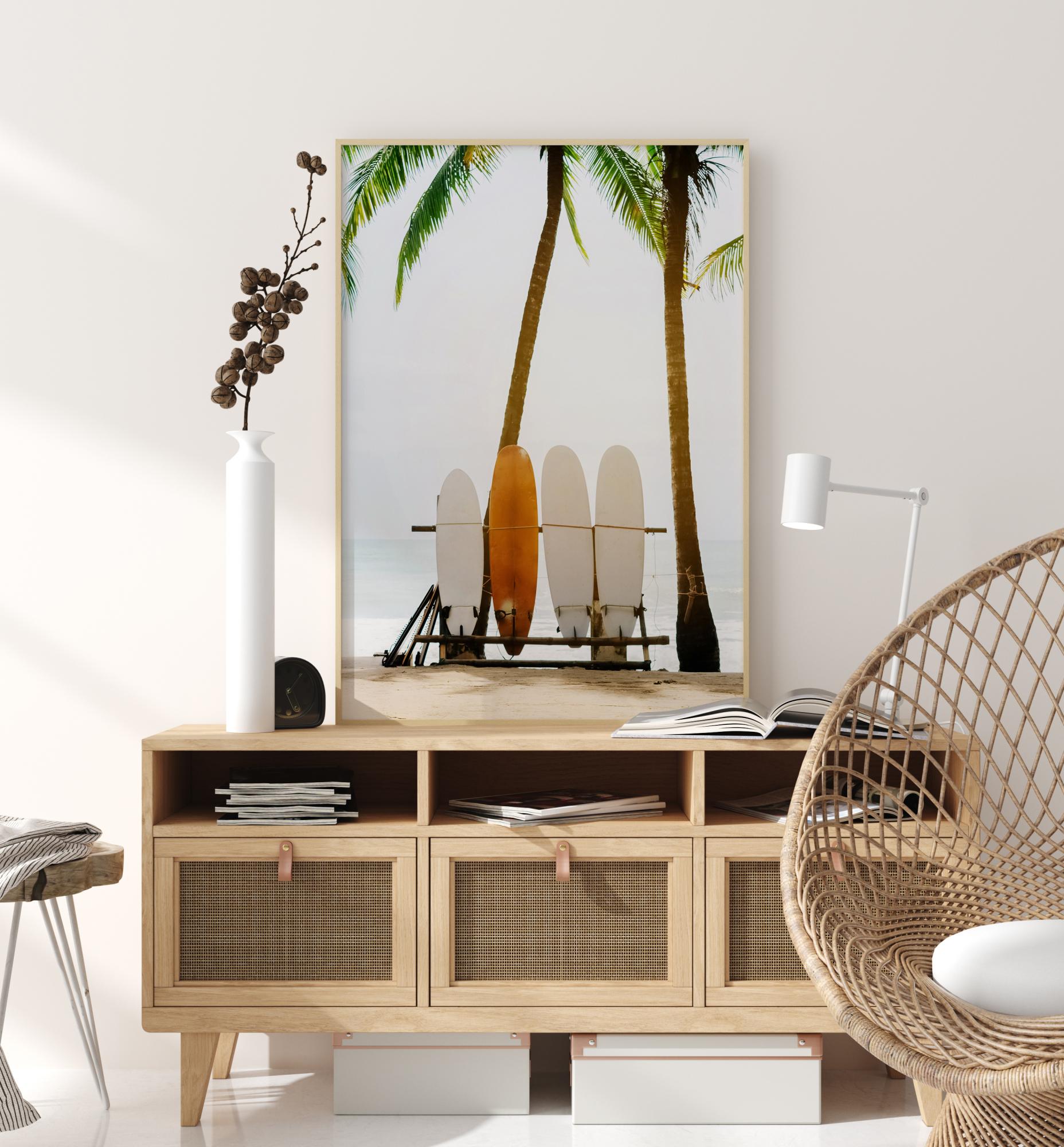 En sommerlig feel good poster med surfebrett, palmer og hvit sand. Et herlig eksotisk motiv i behagelige farger og stilige kontraster. Kombiner gjerne med andre av våre herlige motiv for en større, mer levende bildevegg.