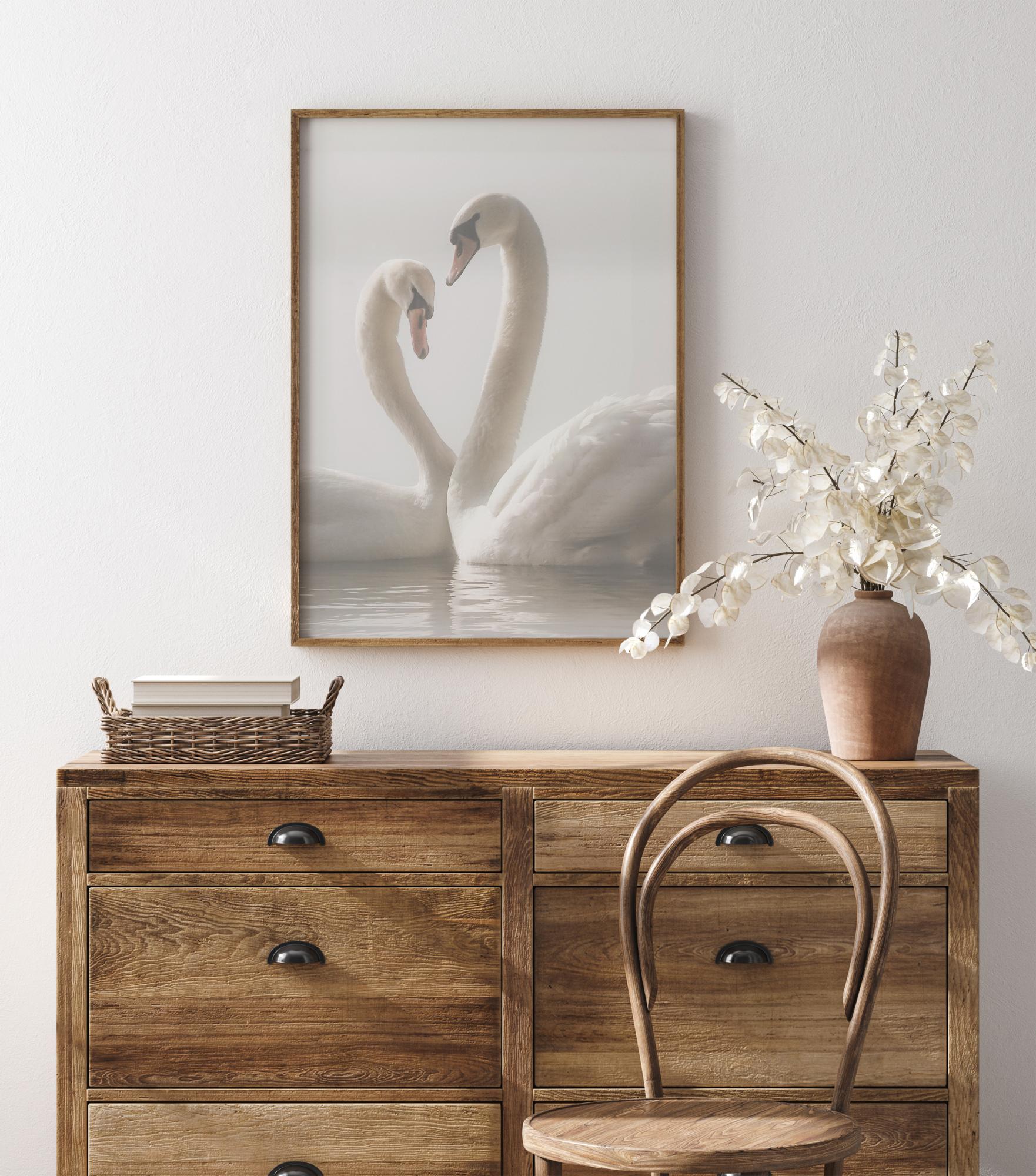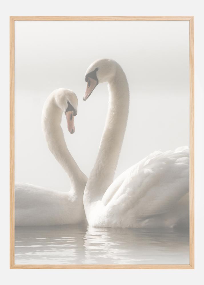 En romantisk plakat med to svaner som svømmer sammen. Den myke belysningen gir en stille ro til dette stykket, mens svanene glir mot hverandre. Nakkene deres stiger opp for å danne en hjerteform. Føl kjærligheten i dette herlige bildet.