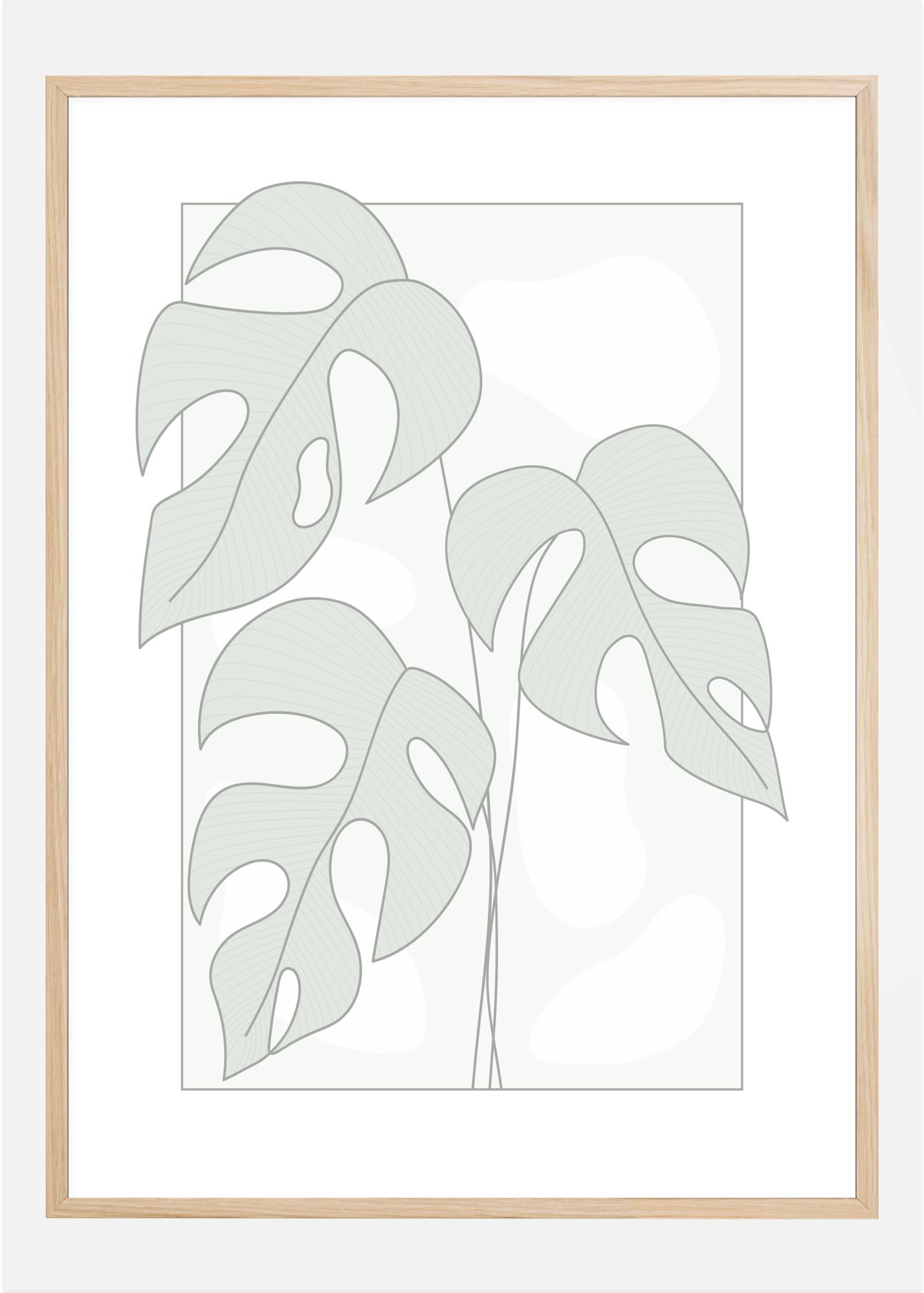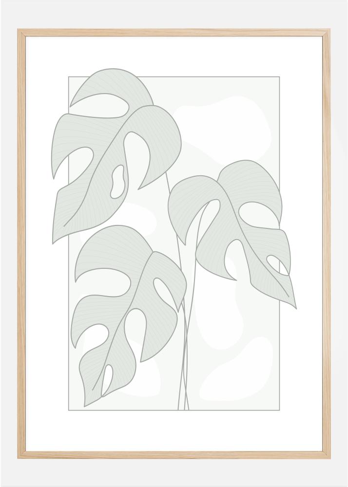 En enkel plakat med illustrative monstera-blader. Tre store blader fyller bildet, hvert i en myk grå tone. Kjekstynne linjer utgjør stilkene i disse elegante bladene med hull i som henger nedover i dette bildet. Behold en rolig stemning ved å henge på en myk grønn vegg for en naturlig følelse.