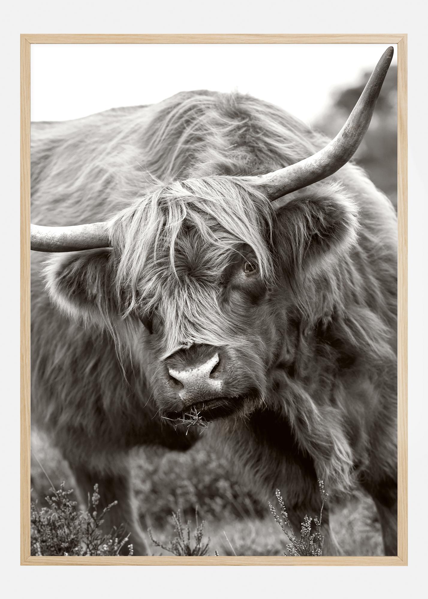 En dyrelivsplakat av en høylandsokse. Oksen lener seg inn i bildet med pelsen hengende over øynene. Ett øye stirrer ut på kameraet, og dens myke bløte pels fanger lyset mens det beveger seg. Til tross for hornene, er oksens ansikt mykt og bedårende, og du kan nesten føle den våte nesen.