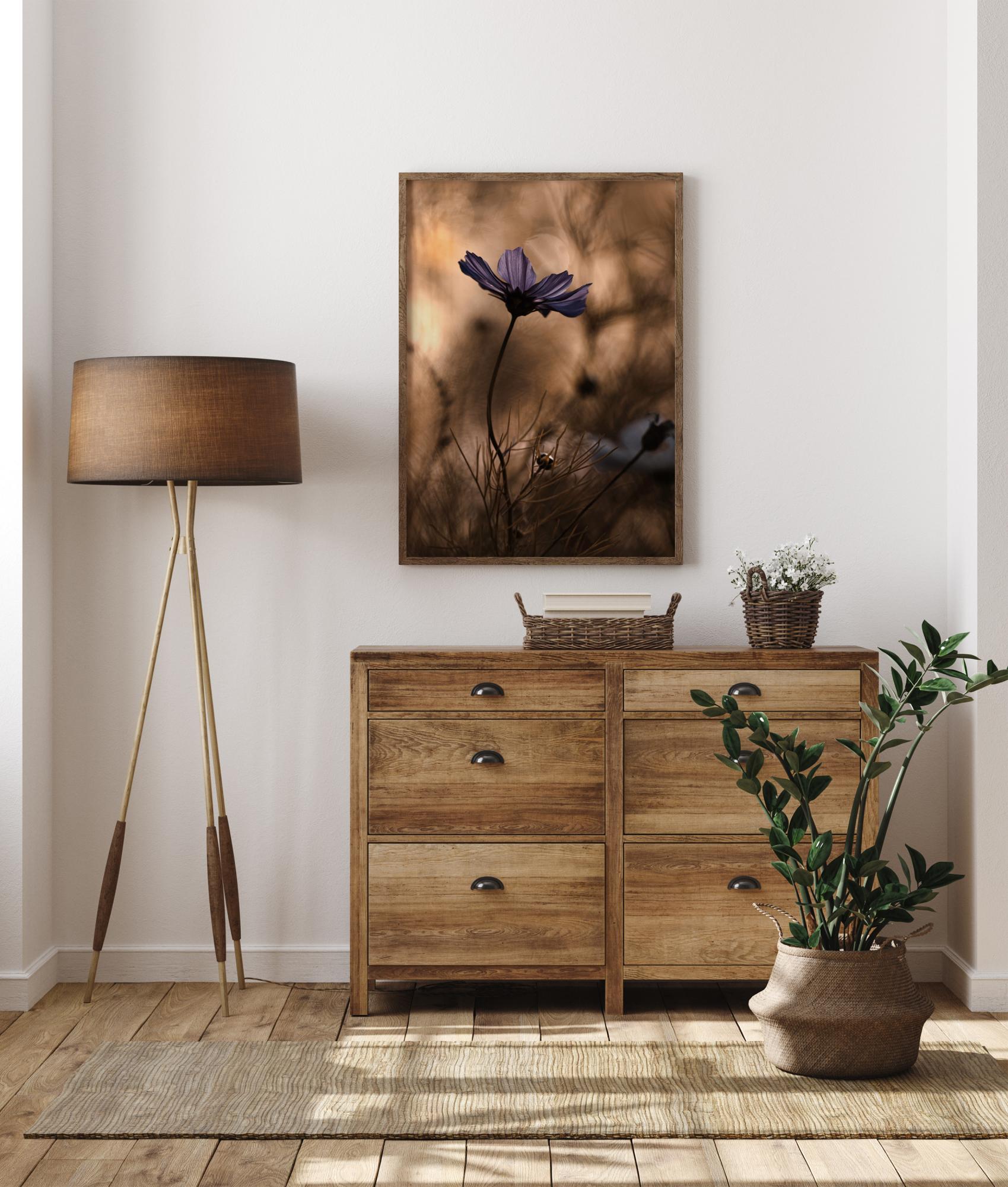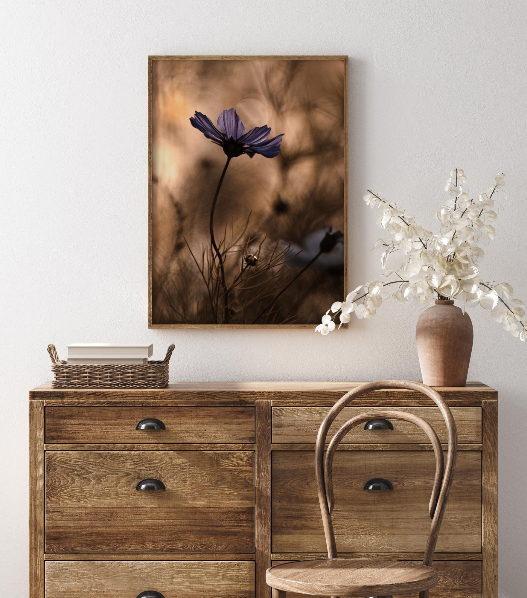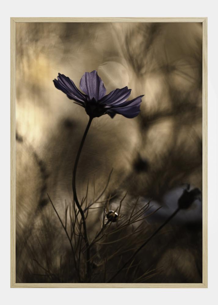 En blomsterplakat med en lyselilla blomst som svaier mot en myk brun bakgrunn. De lilla kronbladene fremheves dramatisk mot de ufokuserte plantene i bakgrunnen. Andre former kommer til syne når blikket beveger seg langs de buede stilkene mens man betrakter hele bildet.