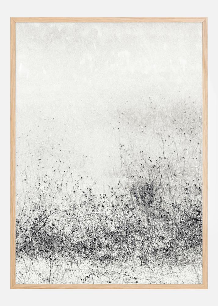 En kunstnerisk plakat med endeløse gressenger i svart-hvitt. De skarpe punktene og linjene får dette til å se ut som et sammenflettet kratt av gress og tornebusker. Det minner om en Jackson Pollack med sine merkelige skribblinger over siden. Linjene står skarpe og lyse og skiller seg ut mot en hvit bakgrunn.