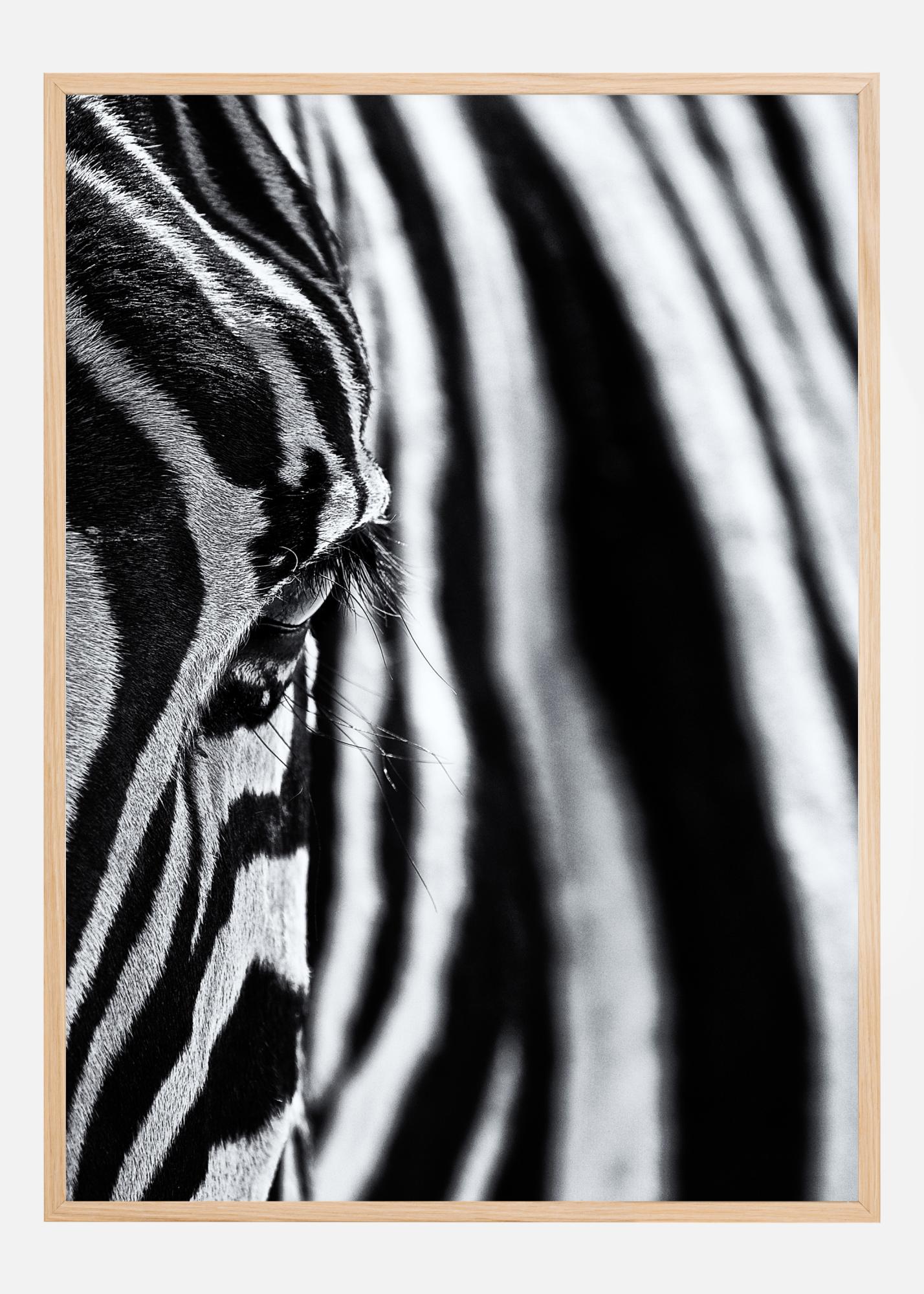 Et nærbilde av siden av en sebras ansikt. De tykke svarte og hvite stripene skaper fantastiske geometriske former som trekker blikket rundt. Sebraens øye og øyevipper legger til litt mykhet i bildet. Heng denne plakaten på en hvit vegg for å beholde den sterke svart-hvitt-effekten.