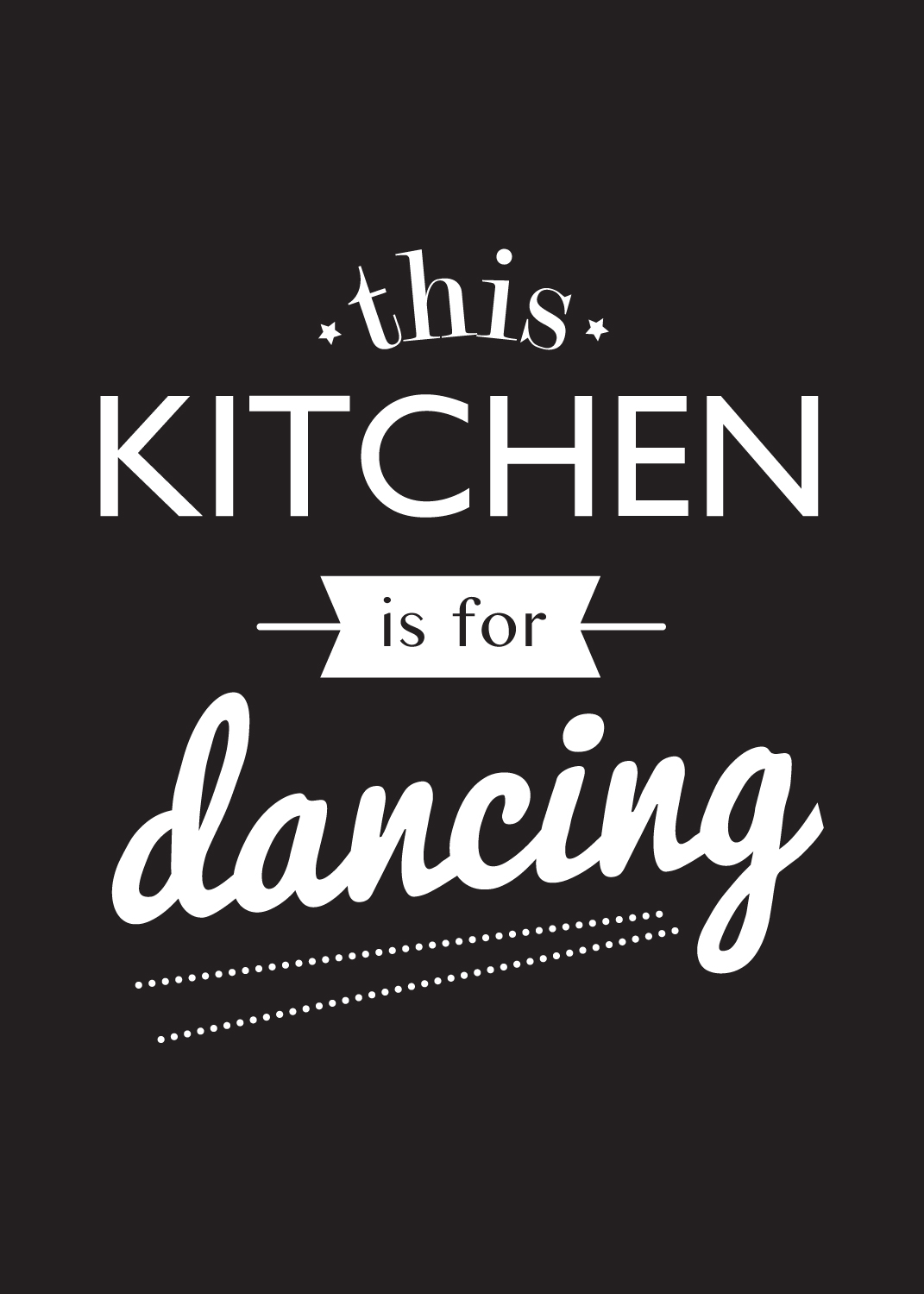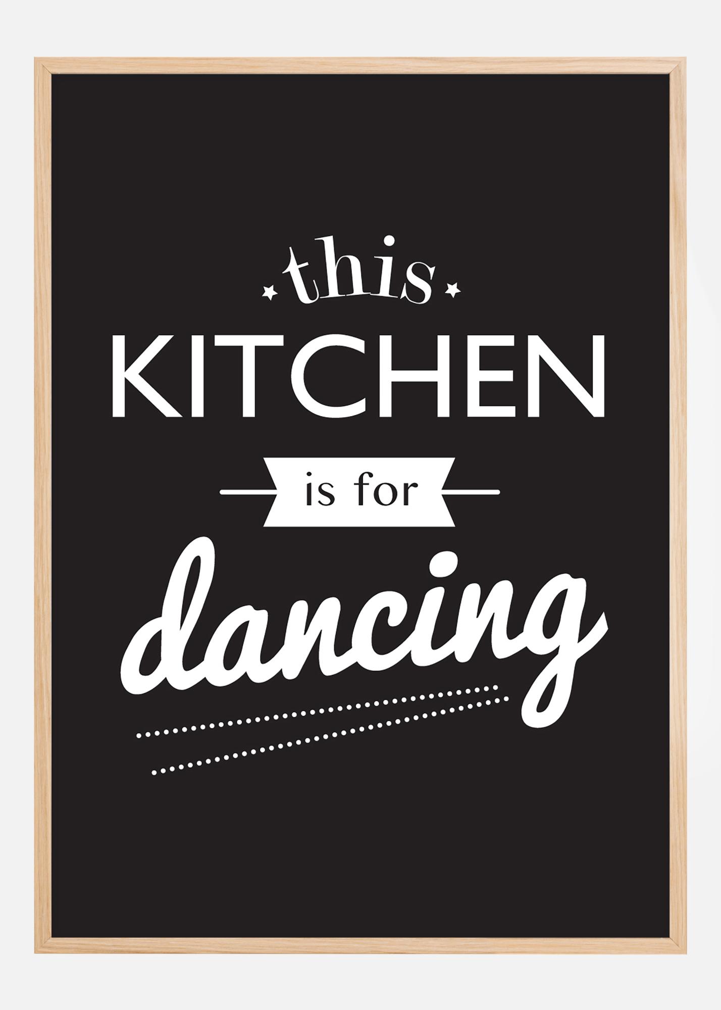 Alle vet at det er kjøkkenet som utgjør hjemmets hjerte. Det er der venner og familie samles for fest og koselige helgemiddager. Dessuten er de fleste kjøkkengulv ultimate for ville danse øyeblikk! Denne stilige poster tilfører en herlig følelse til ditt kjøkken og oppmuntrer deg når du må ta deg av kjedelig oppvask. This Kitchen is for Dancing har en svart bakgrunn og et hvitt trykk i form av former og mønster sammen med teksten ”This kitchen is for dancing”. Hvert ord er trykket med en egen font, noe som gir et lekent uttrykk. Heng den opp som den er eller kompletter med en lekker ramme. Velg mellom 6 ulike format!