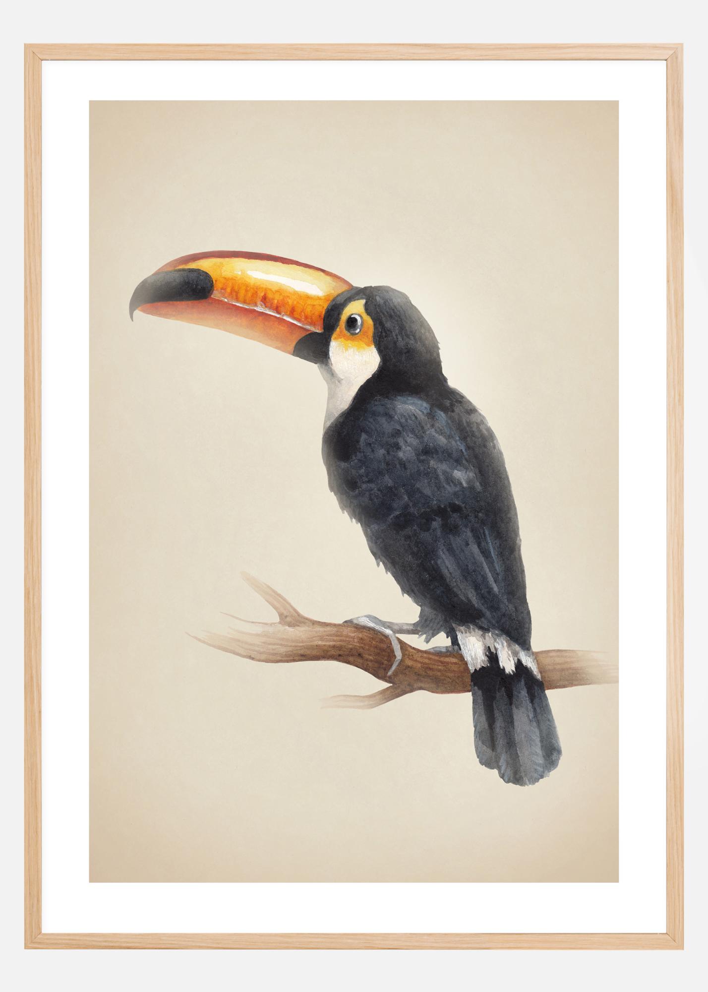 En søt portrettplakat av en tukan med stort nebb. Dette maleriet gjør at det gule nebbet står ut fra den grå bakgrunnen. Med ryggen delvis vendt mot betrakteren, skinner fuglens glatte svarte fjær i dette enkle bildet. Kombiner med en annen tropisk fugleplakat for å danne et perfekt sett.