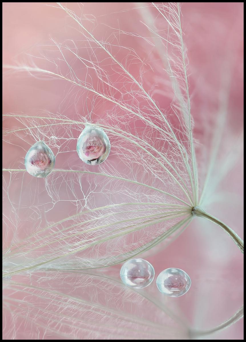 En elegant plakat med et edderkopplignende blomsterhode med to dråper vann som ivaretar de de skjøre fjærtuppene. En lyserosa bakgrunn lyser gjennom hver av de perfekte vanndråpene der de henger rett før de slipper av blomsten. Nyt den delikate naturens balanse.