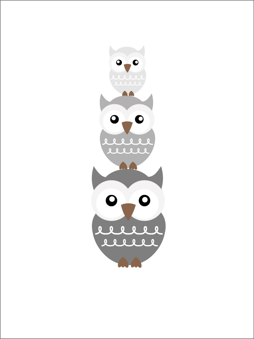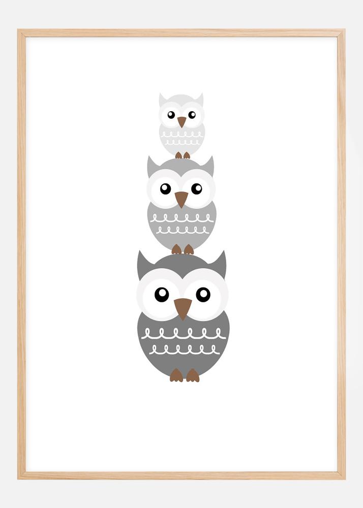 Tre er bedre enn én. Plakatkunst med verdens hippeste fugl, uglen. Illustrasjonen av tre stiliserte, tåkegrå ugler stablet oppå hverandre med hvit bakgrunn har blitt en moderne klassiker. Motivet passer like bra inn på stua som på barnerommet, og vil ta seg ekstra bra ut med en innredning som matcher fargen på plakaten. Kombiner med andre fugler eller dyr for en atmosfære av villmark.