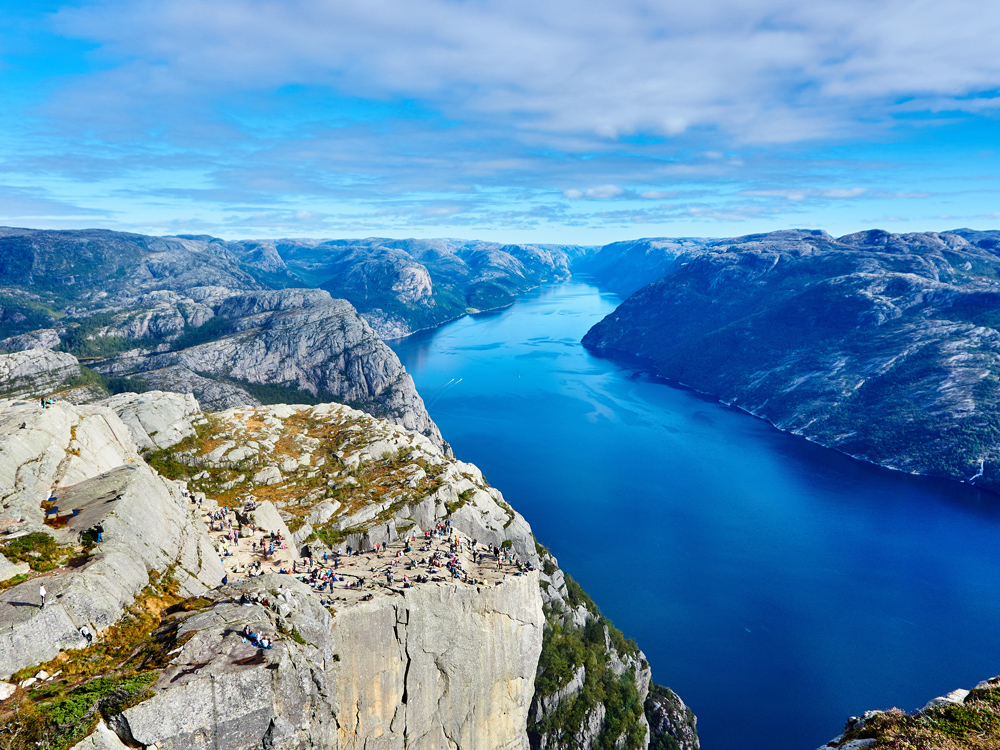 Fotografi med fantastisk panoramautsikt over en dyp fjord. Bildet er i havblå farger med solbelyste, nakne klipper på begge sider av fjorden. Et praktfullt landskap som passer på veggen hos dem som setter pris på vakker natur. Komplementer bildet med en ramme som fremhever motivet.