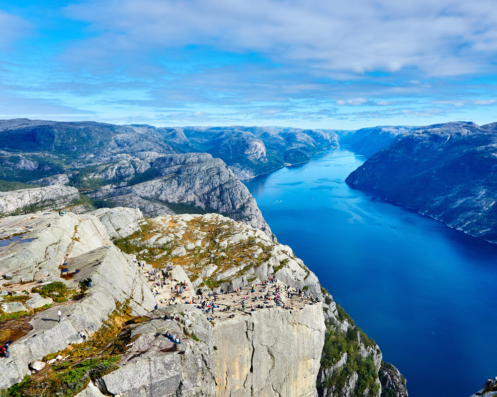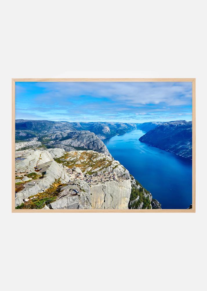 Fotografi med fantastisk panoramautsikt over en dyp fjord. Bildet er i havblå farger med solbelyste, nakne klipper på begge sider av fjorden. Et praktfullt landskap som passer på veggen hos dem som setter pris på vakker natur. Komplementer bildet med en ramme som fremhever motivet.