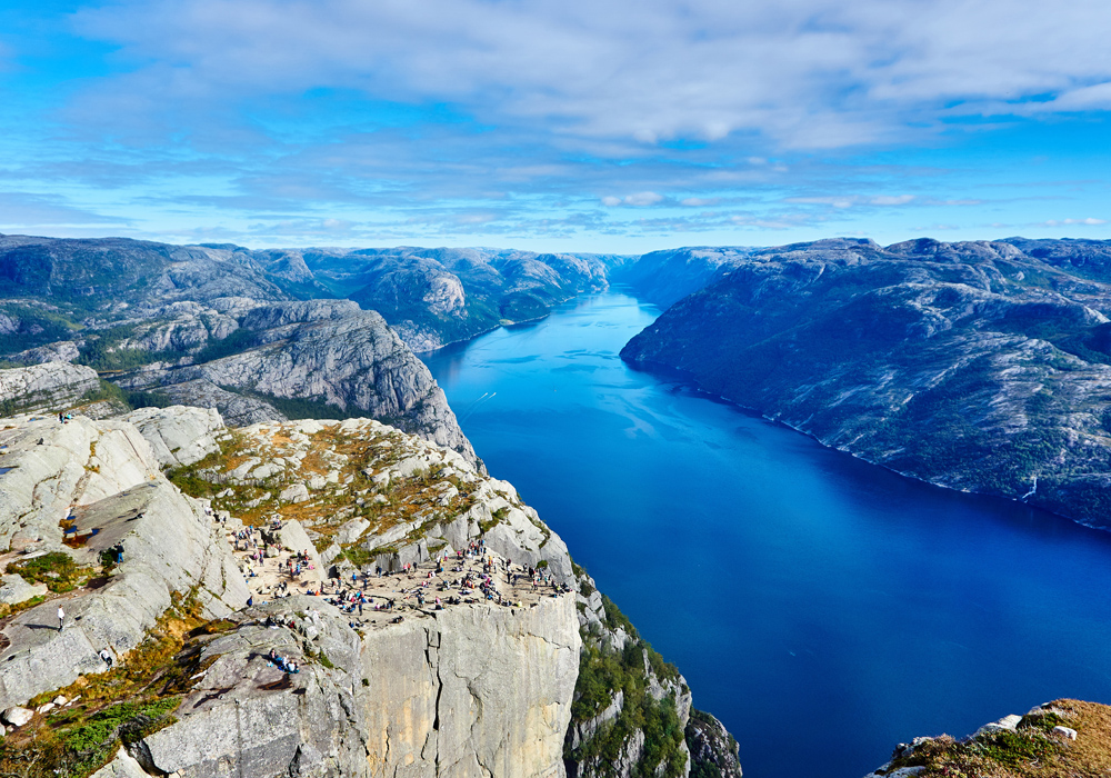 Fotografi med fantastisk panoramautsikt over en dyp fjord. Bildet er i havblå farger med solbelyste, nakne klipper på begge sider av fjorden. Et praktfullt landskap som passer på veggen hos dem som setter pris på vakker natur. Komplementer bildet med en ramme som fremhever motivet.