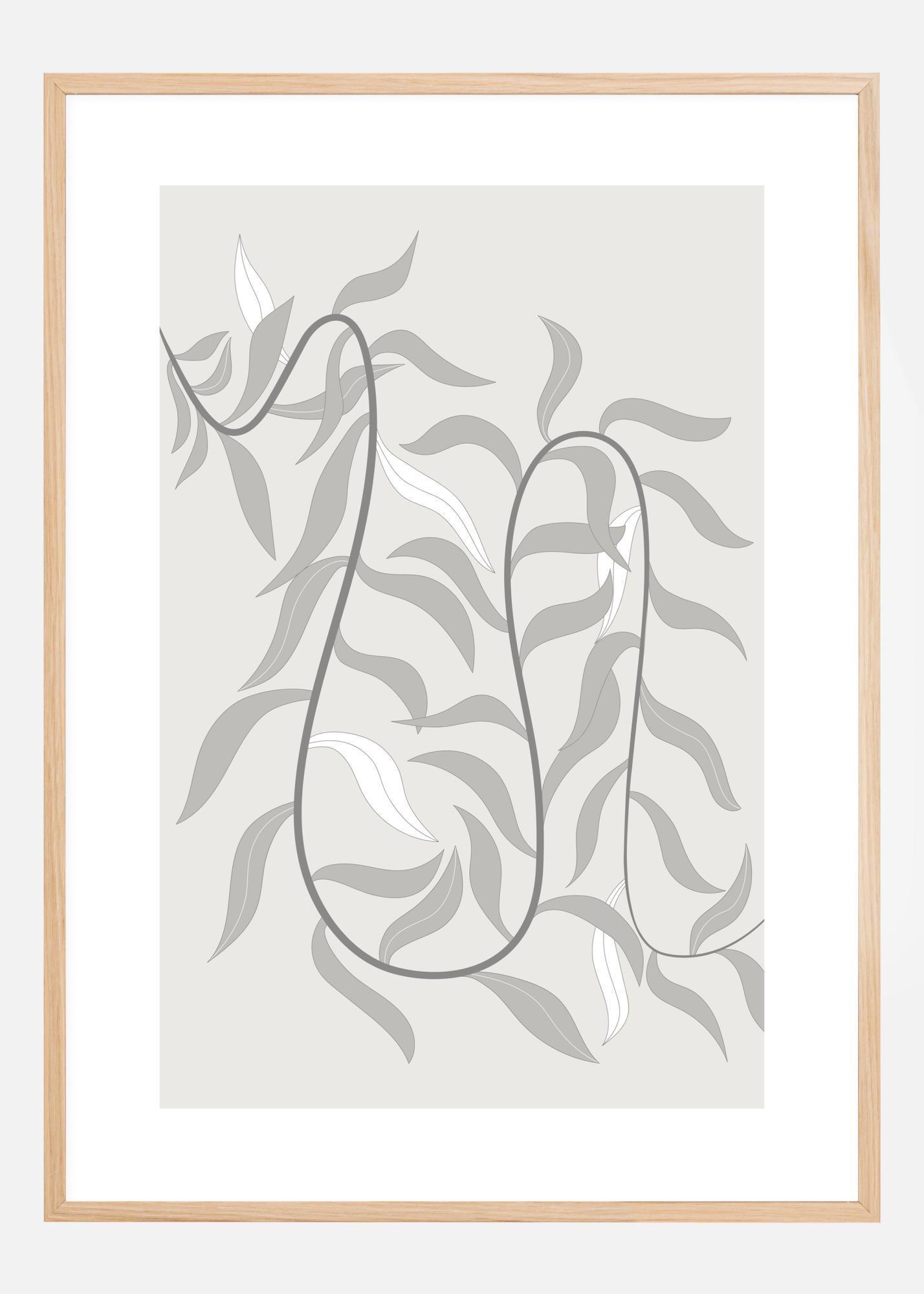 En abstrakt botanisk plakat med et krypende vintre som vikler seg over plakaten. Den enkle trykkstilen viser bladene i lysegrå og hvitt. Et mørkegrått vintre snorkler seg mellom bladene og fletter de sammen i en slynget stil. Kombiner med en myk grønn vegg for å få bladaktig følelse.