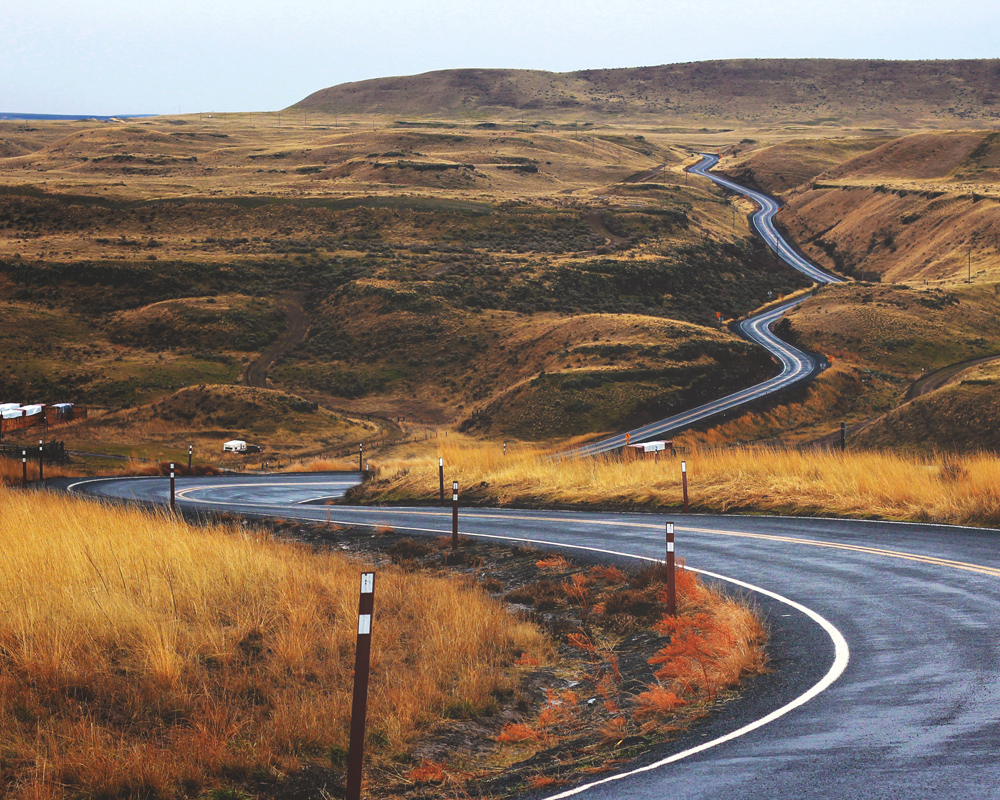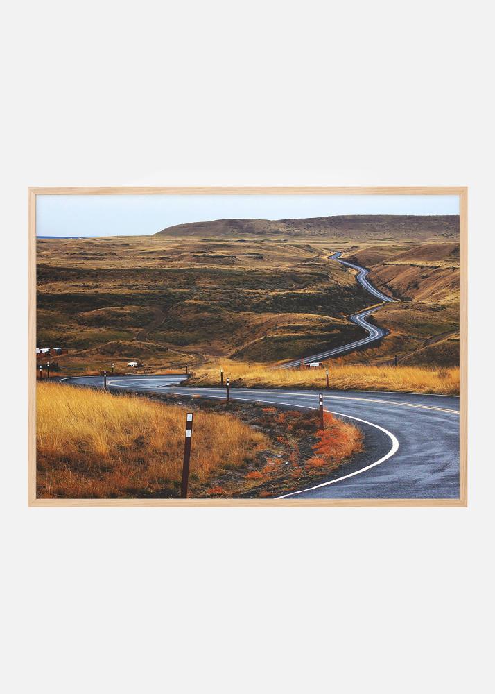 Plakat av en asfaltert vei som snor seg gjennom et solbrent steppelandskap. Det gulbrune gressets nyanser er en kontrast mot det kalde asfaltdekket som bryter gjennom det åpne landskapet og gjør at blikket trekkes mot bildet og følger veien. Bildet passer godt i en minimalistisk ramme hvor motivet kan komme til sin rett, og kan fint kombineres med andre bilder med lignende tema.