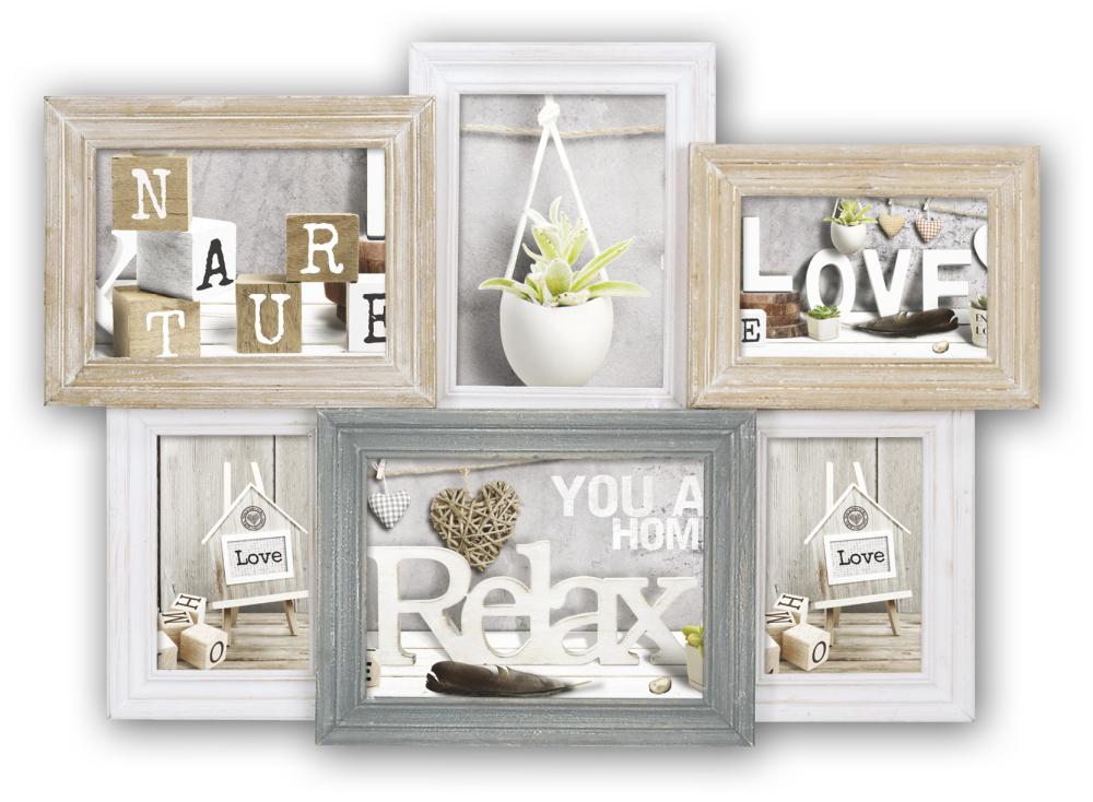 La denne sjarmerende collagrammen tilføre en naturtro og avslappet følelse til ditt hjem! Rammen har plass til 6 bilder i ulike format. Listene går i trefarget, grått og hvitt med slitte detaljer.