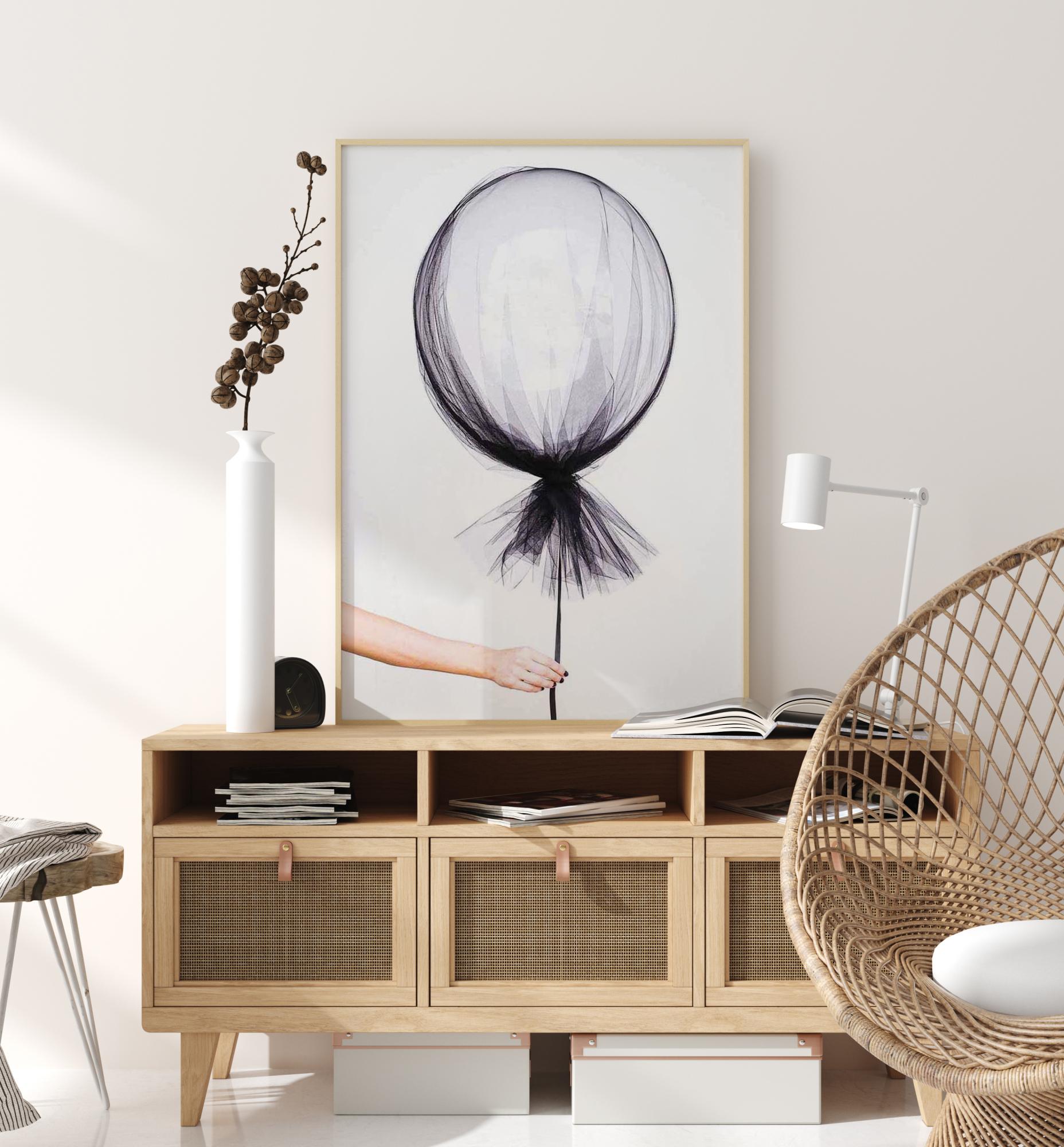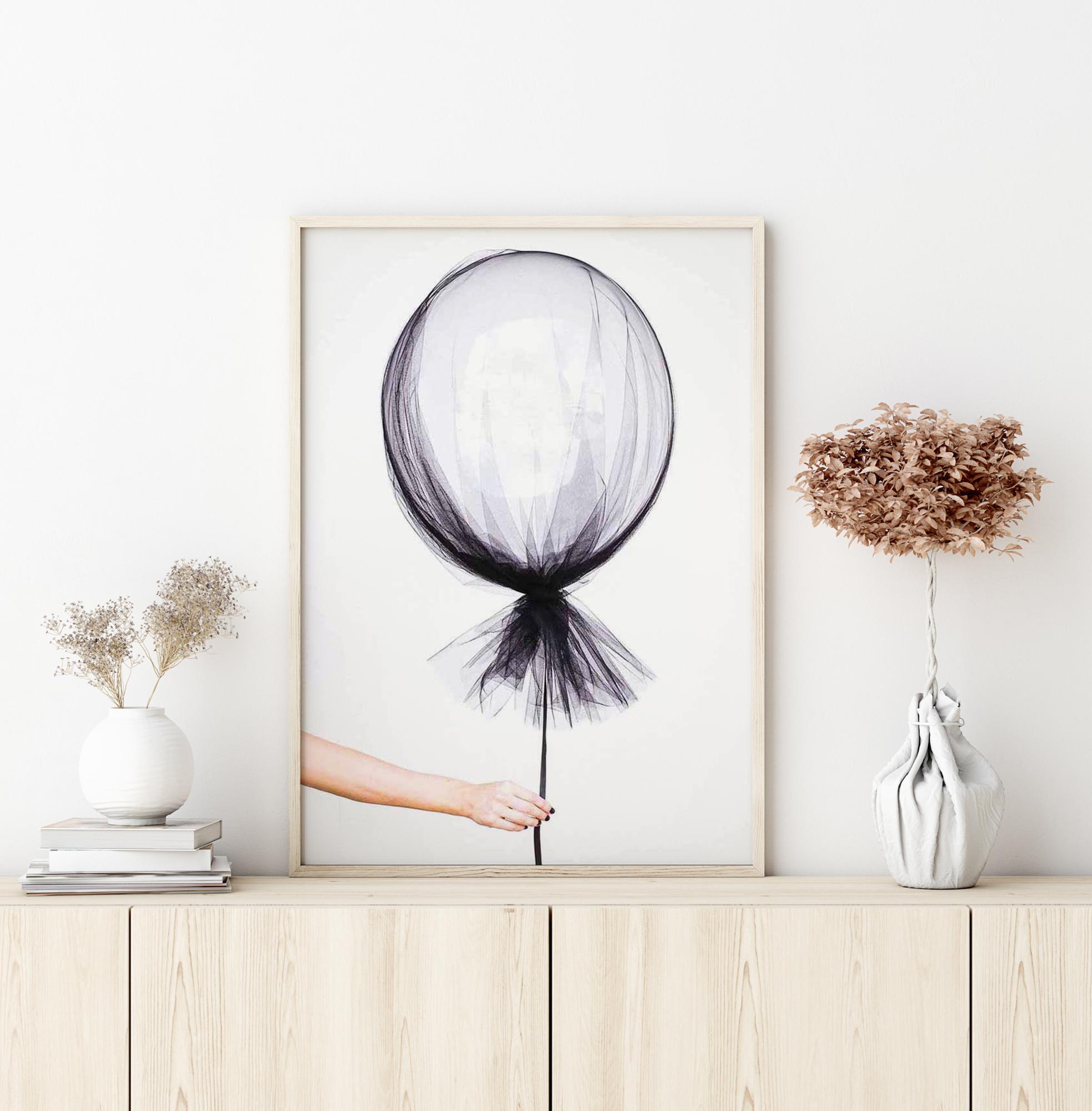 Stilren fotografisk kunst av en hånd som holder en svevende ballong omsluttet i tynt gjennomsiktig stoff. En sjarmerende poster som puster en herlig blanding av det lekent lette og det skjøre og ømtålige. Passer like godt i barnerommet som i det moderne hjem.