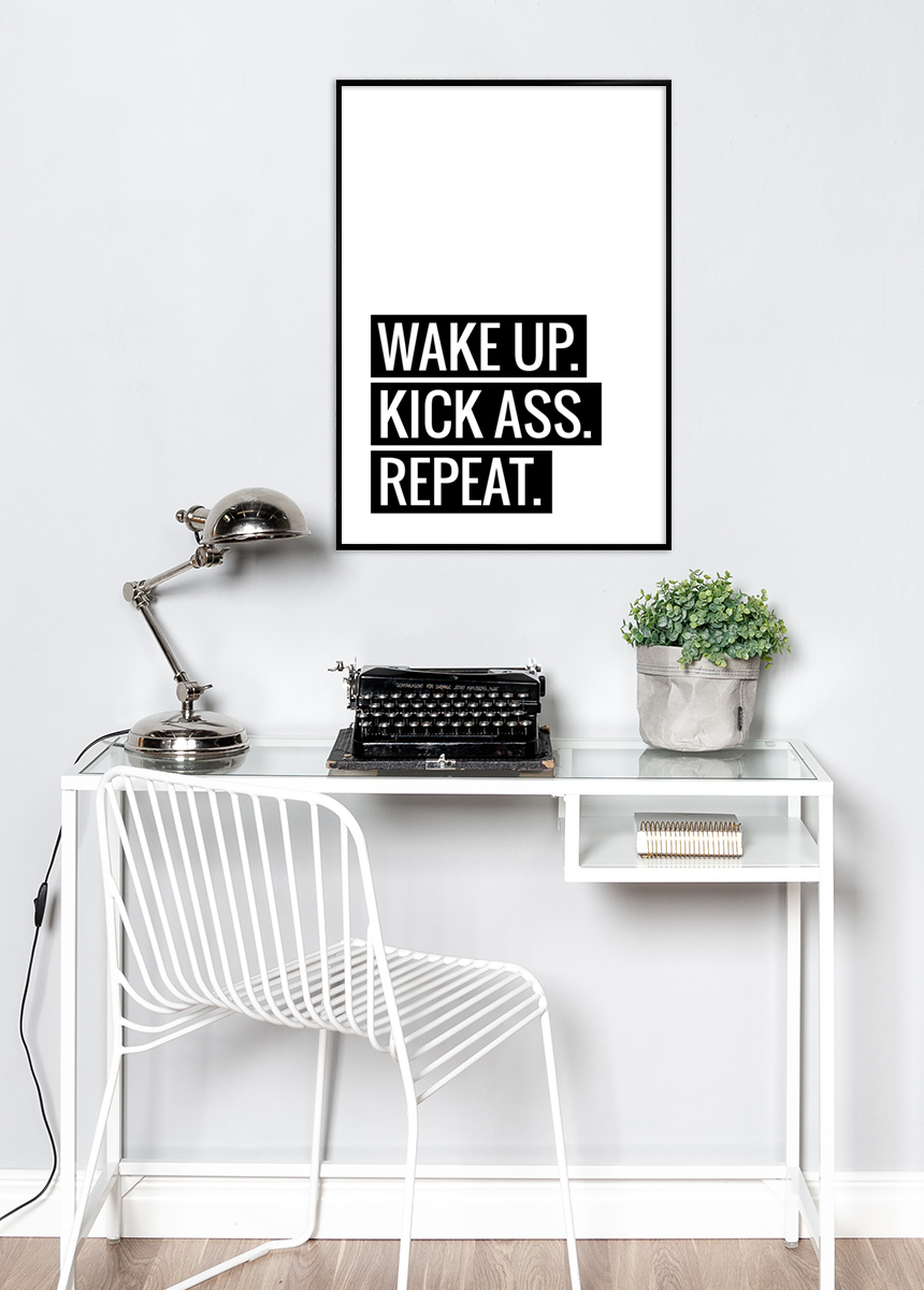 Å være helt rå hver dag faller ikke alltid naturlig. Det er ingenting å skammes for! Oppmuntre i stedet deg selv til å være det gjennom å henge denne kjepphøye poster på veggen. Plakaten er av et stilig og enkelt design med hvit bakgrunn og et svart og hvitt trykk med teksten ”Wake up. Kick ass. Repeat.” Finnes i 6 ulike format og prisklasser. Kompletter gjerne med en svart eller fargerik ramme fra vårt store sortiment.