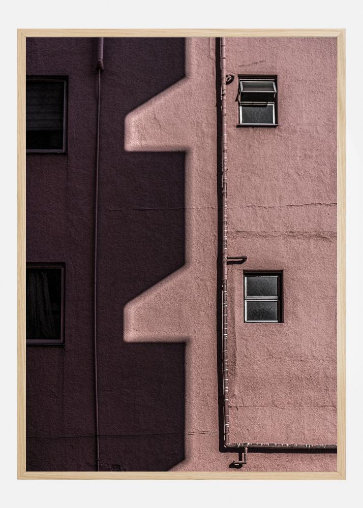 En bygningsplakat med utsiden av en mørk rosa bygning. Skygger og lys kaster rare figurer på siden av bygningen. Vinduene ser ut som øyne, som markerer skyggene som ser ut som neser. Dette bildet ser ut til å stirre rett tilbake på deg.