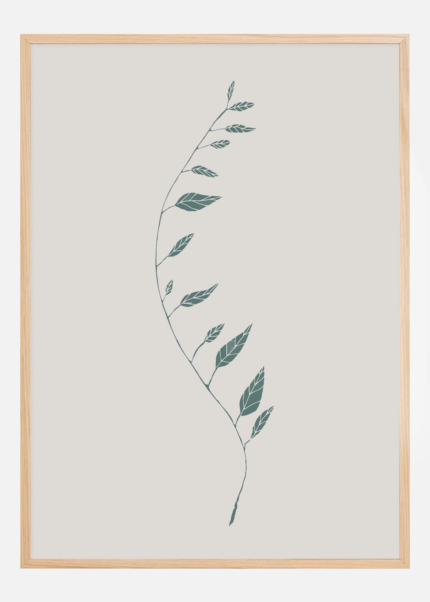En minimalistisk plakat med en lang grønn gren som bøyer seg forsiktig mot en hvit bakgrunn. Grenens tynne linje bølger forsiktig, og alle bladene er på samme side som om en vind blåser i dem. Plakatens enkelhet uttrykker en rolig følelse, perfekt for en avslappende baderomsstemning.