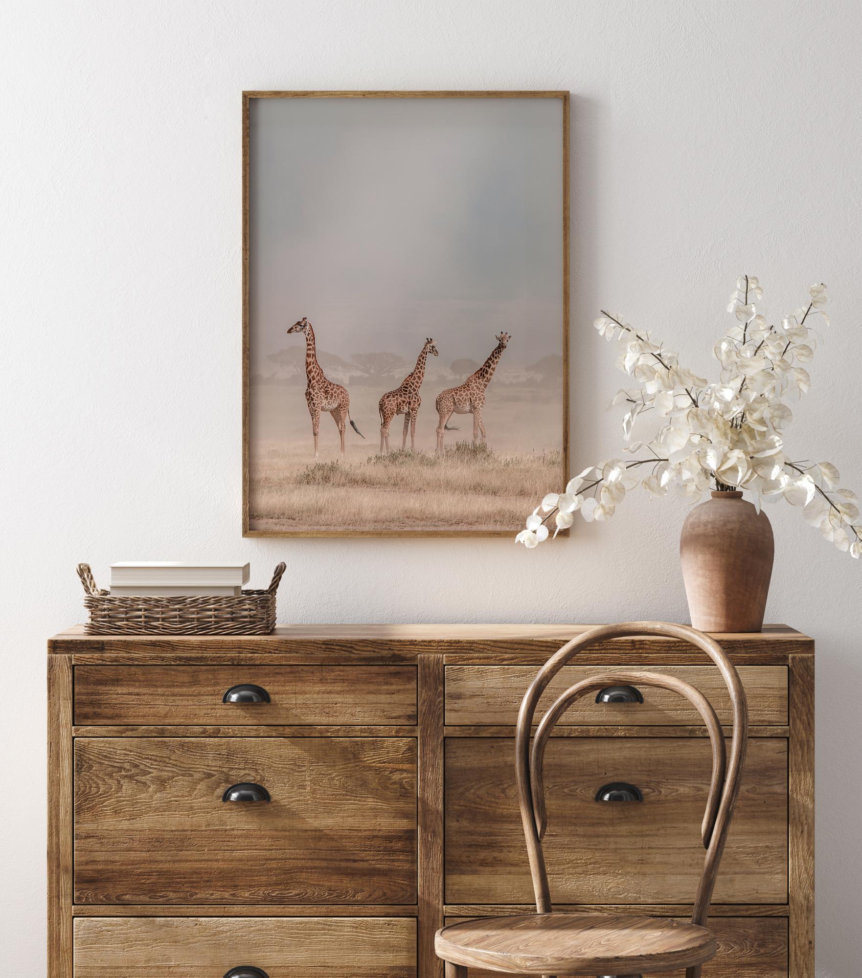 En vakker dyrelivsplakat med tre sjiraffer på den afrikanske savannen. Sjiraffene ser ut i forskjellige retninger idet de værer Amboseli-virvelvinden som snurrer opp og skaper en tåket effekt. Besøk Afrika uten å forlate huset ditt med denne følelsesladde plakaten.