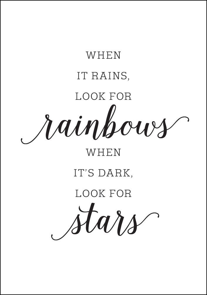 En inspirerende plakat med et sterkt sitat som bør være slik du lever livet ditt. «Når det regner, se etter regnbuer, når det er mørkt, se etter stjerner». Ord å leve etter i denne enkle svart-hvitt-plakaten. Nyt denne og se på den lyse siden av livet uansett når på dagen du stopper opp for å lese dette sitatet.