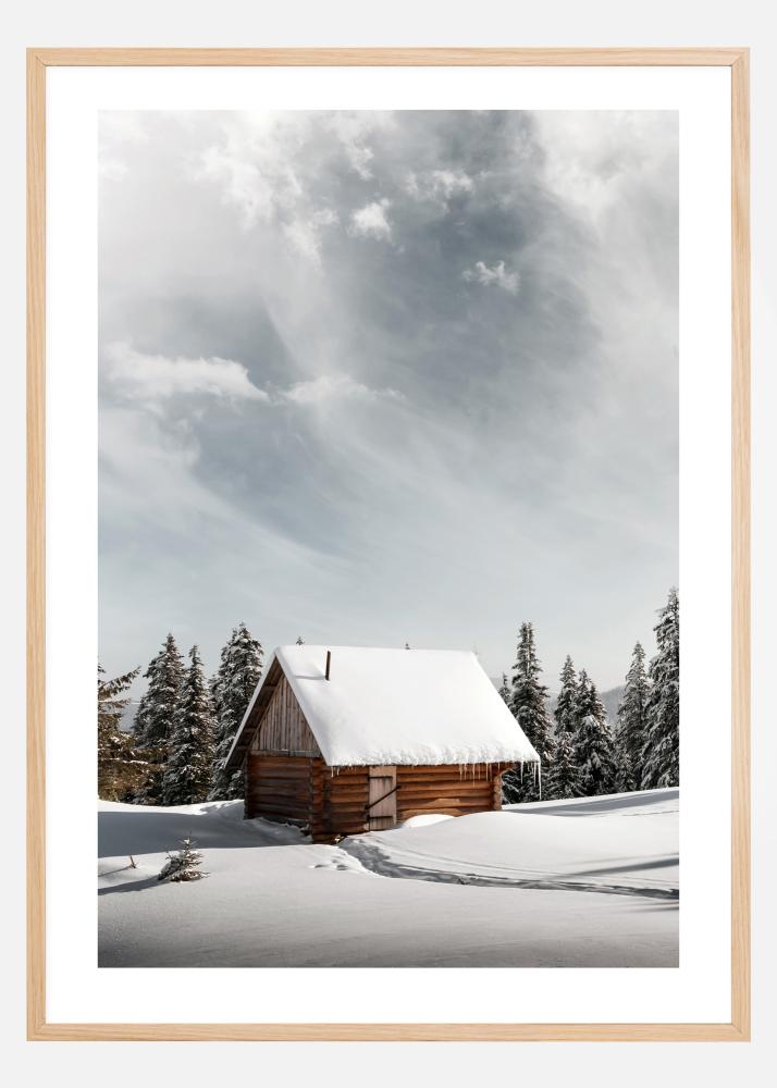 En juleplakat med en liten trehytte i et snøhvitt landskap. Myk snø dekker bakken og hyttetaket i dette vinterlige bildet. Grantrær er dekket av snø og mørkegrå snøskyer fyller himmelen, klar til å bringe mer snø. Føl vinterens kulde i denne elegante plakaten.