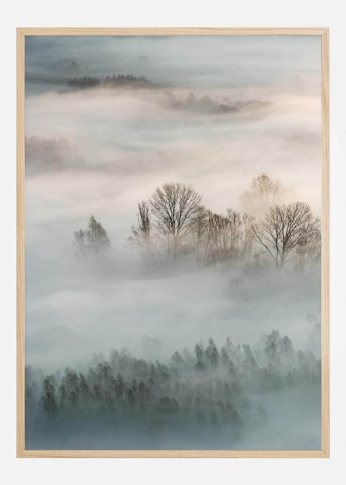 En magisk plakat med et tåkete skoglandskap. Tåke dekker det meste av området, og trær dukker opp her og der som små øyer i tåken. Et mykt rosa lys skinner gjennom tåken som skaper en varm følelse i dette eventyrlignende landet.