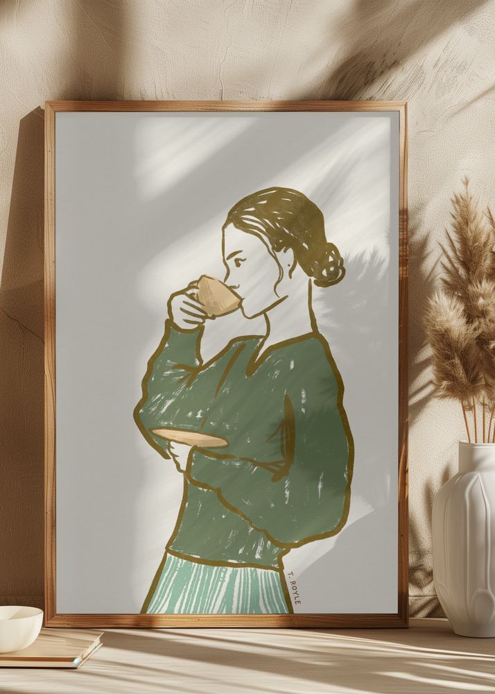 https://www.bgafotobutikk.no/Woman-Drinking-Tea-in-Green-Plakat-40x60-cm