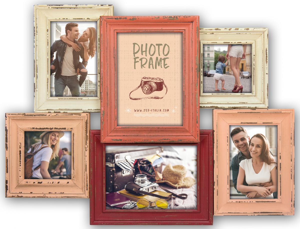 Dette er en flott og rustikk collageramme i ulike rød- og kremnyanser. Collagerammen har plass til 6 bilder i bildeformatene 10 x 10 cm, 10 x 15 cm og 13 x 18 cm. Rammen har et utvendig mål på 54,5 x 41,5 cm. Rammen kommer i et noe slitt design som forsterker det unike uttrykket og gjør den til et blikkfang i hjemmet. Har veggfeste.