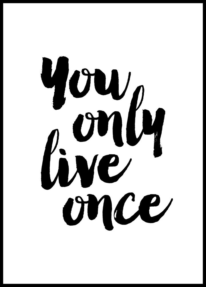 Livet går så kjapt forbi at vi tullete nok glemmer hva det egentlig handler om. Hva betyr mest for deg? Familien og vennene? Å reise til spennende land eller å løpe i skogen? Uansett hvilken, påminner denne sjarmerende posteren deg om å gjøre det nå og ikke i morgen. Vi lever bare en gang! Plakaten har et stilig og enkelt design med teksten ”You only live once” i svart mot en hvit bakgrunn. Den finnes i 6 ulike format og prisklasser. Kompletter gjerne med en stilig ramme i din favorittfarge.
