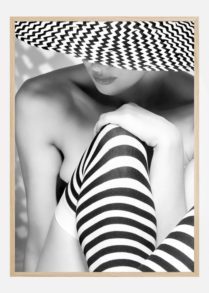 En geometrisk portrett-plakat av en kvinne i en mønstret lue og stripete strømper. Hun lener seg fremover med en hånd på kneet sitt. Ansiktet hennes er skjult av hattens mønster i dette fremragende bildet. Kombiner plakaten med et snev av farge på veggen din, og se hvordan mønstrene eksploderer.