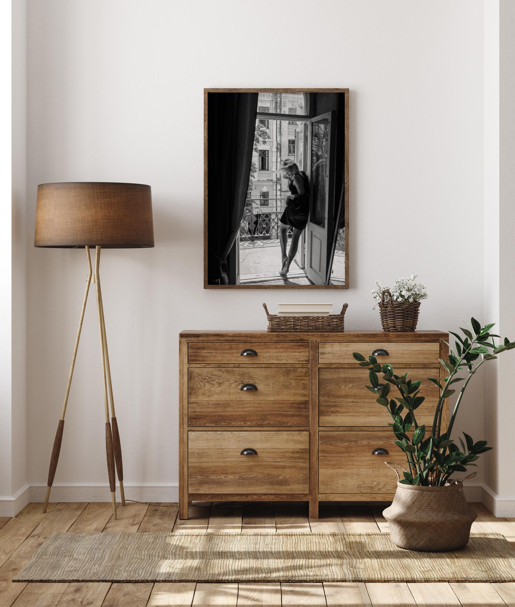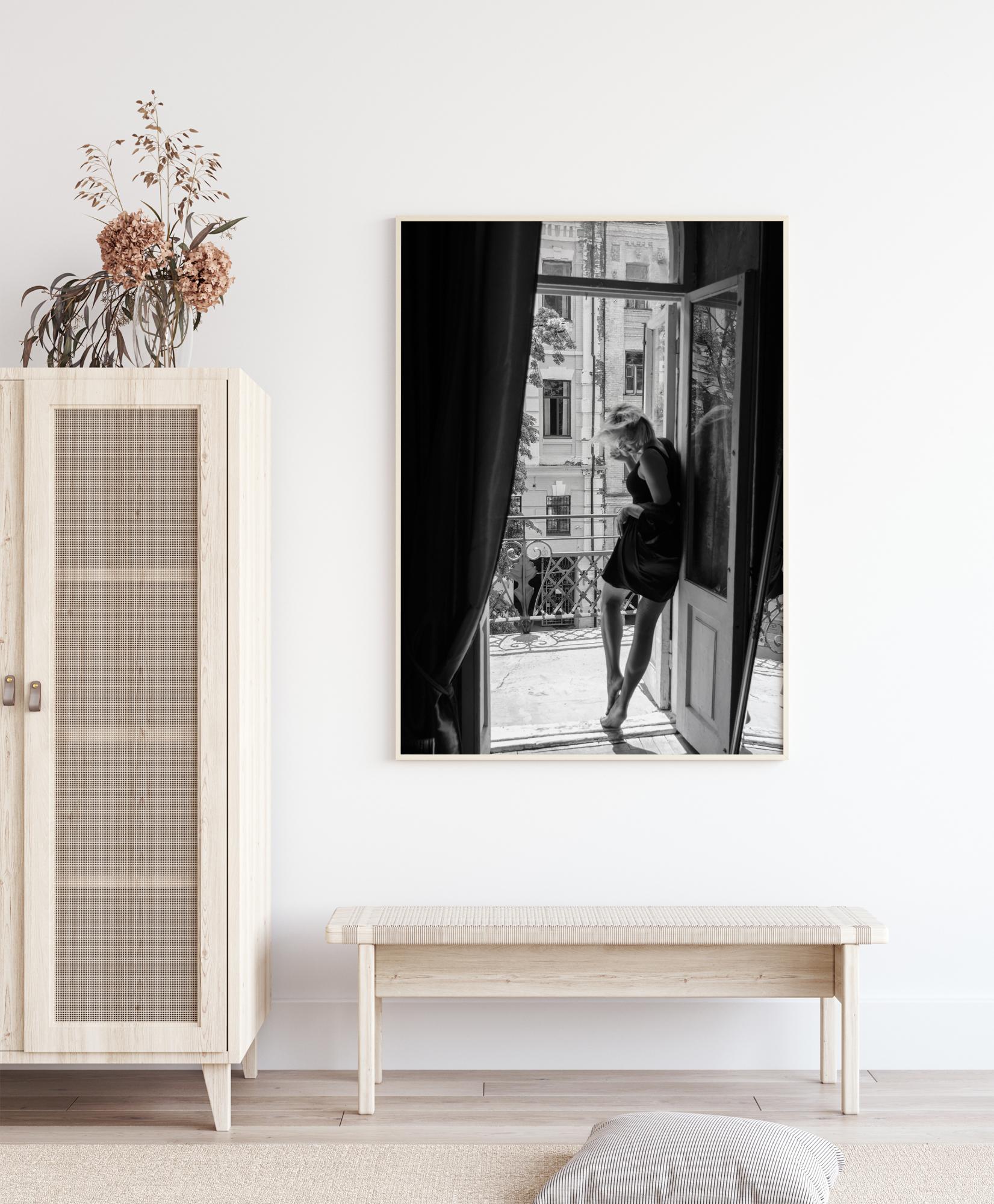 En klassisk plakat av en kvinne på en balkong i Paris. Kvinnen har på seg en svart kjole som forlenger de nakne bena og lener seg på en dør mens hun står på tå og ser på føttene sine. Heng opp denne svarte og hvite plakaten på en fargerik vegg for et snev av eleganse.
