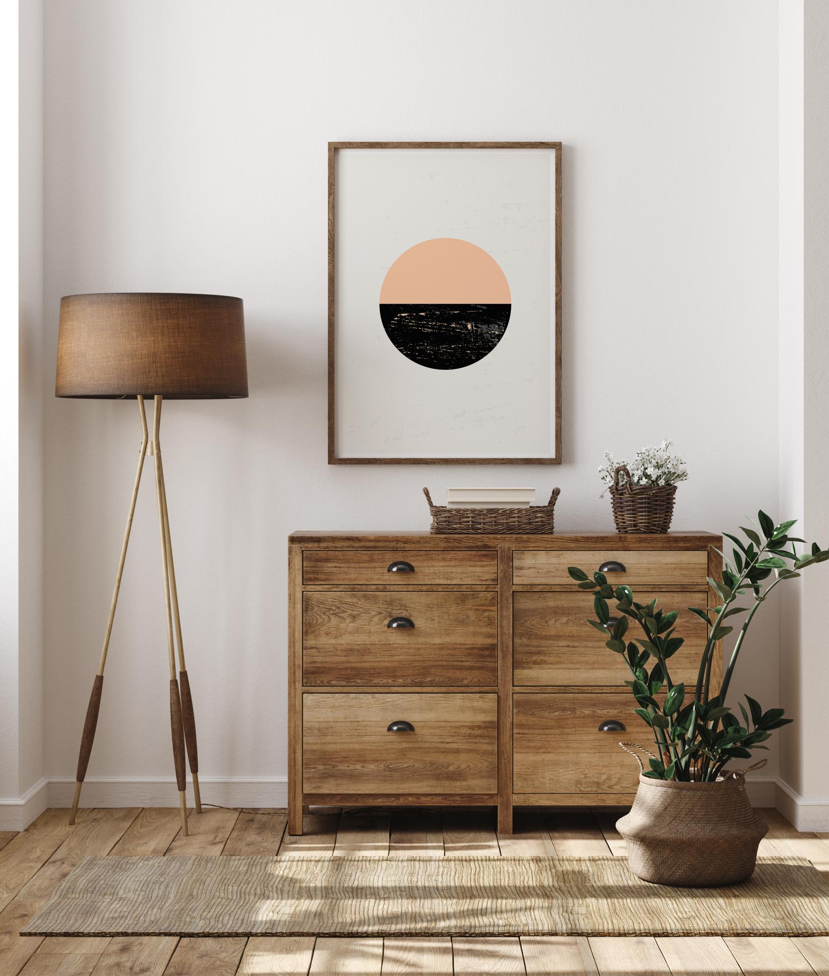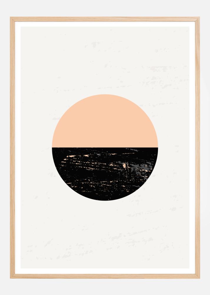 En minimalistisk plakat av en sirkel i to forskjellige farger. Sirkelen vises mot en hvit bakgrunn, og den øverste halvdelen er en myk fersken eller rosa. Den nederste halvdelen er svart med et design av et bybilde om natten, med lysene som blinker i mørket. Dette blir garantert et samtaleemne når du henger det opp hjemme.