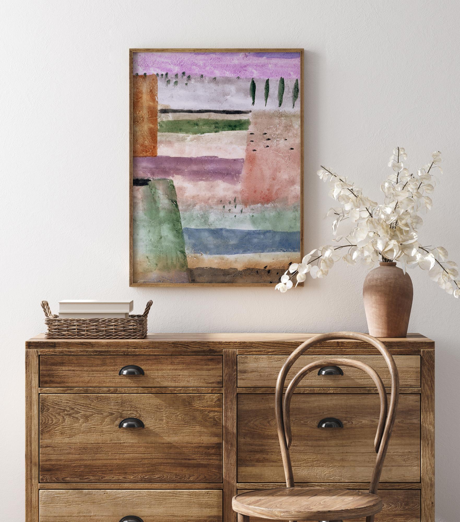 En abstrakt pastellplakat med et lagdelt, teksturert preg. Plakaten har det som ser ut til å være en strand, et hav, fjell, gress og trær som forsvinner i det fjerne. Bildet inneholder en rekke blå, lilla, appelsiner og grønne toner, alle i myk pastell. Denne rolige scenen gir deg sinnsro og hvile.