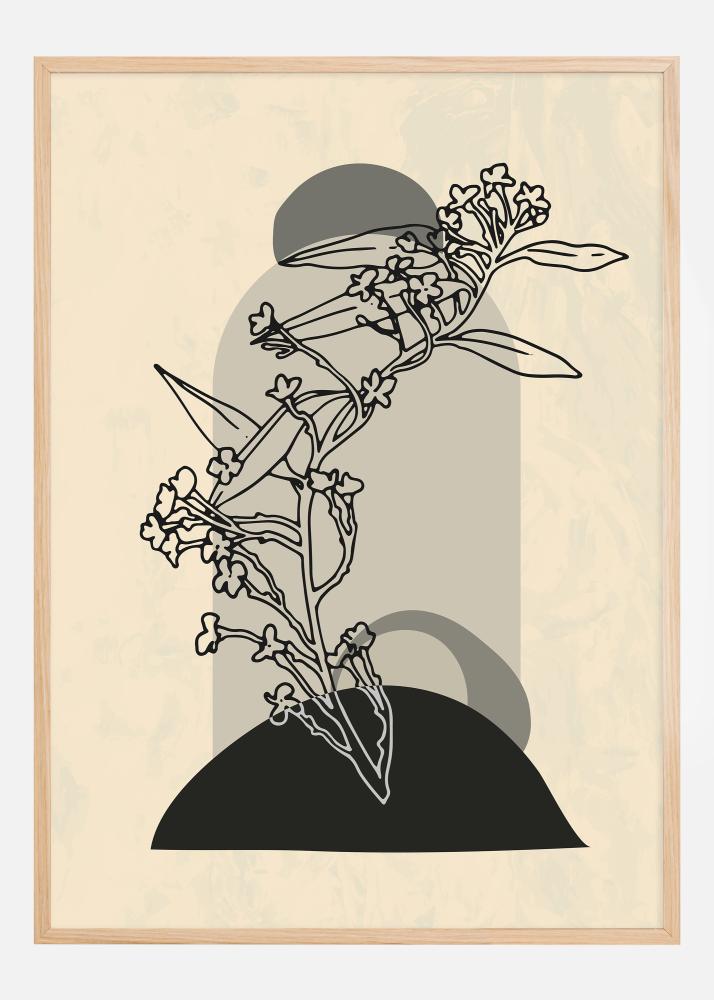 Denne sofistikerte posteren fremstiller en abstrakt blomsterstilling som kombinerer naturlige former med grafiske elementer for en samtidsfølelse. Motivene bruker en subtil fargeskala med myke beige toner og dristige svarte linjer, noe som gir en kontrast som er både iøynefallende og elegant. Designet legger stor vekt på komposisjon og balanse, og plasserer de organiske formene av blomster og blader over en solid svart halvsirkel, som skaper en illusjon av skygge og dybde.