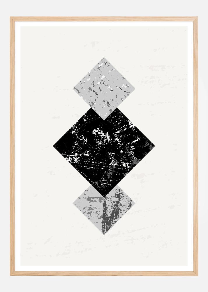 En geometrisk plakat med tre firkanter midt på en hvit bakgrunn. Den store firkanten i midten er svart med marmoreffekt, og på hver side er det to mindre blå firkanter med marmor- og rullesteinseffekter. Øyet trekkes gjennom stykket av punktene på hver firkant i dette nesten symmetriske verket.