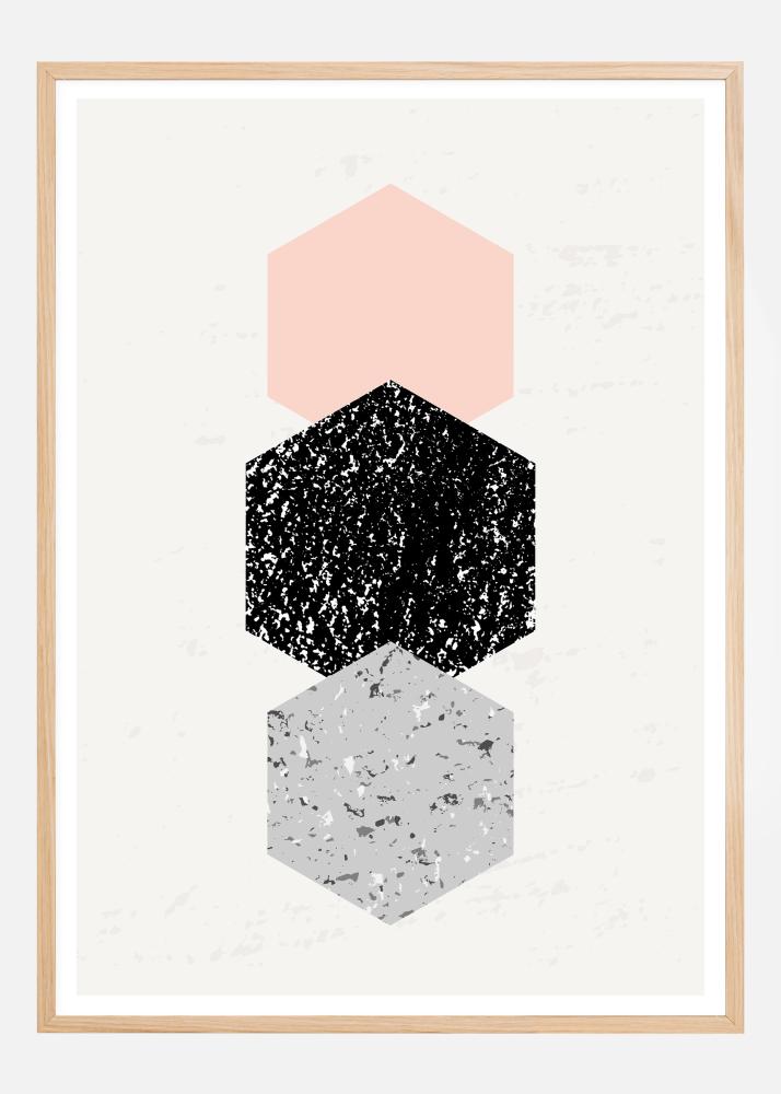 En abstrakt plakat med tre sekskanter oppå hverandre. Den øverste er lysrosa, den større i midten er en svart- og hvitflekket, og den nederste er en blå småstein-stiplet sekskant. Dette stykket er et skikkelig blikkfang, men samtidig uten distraksjoner som gjør det perfekt for et hjemmekontor.
