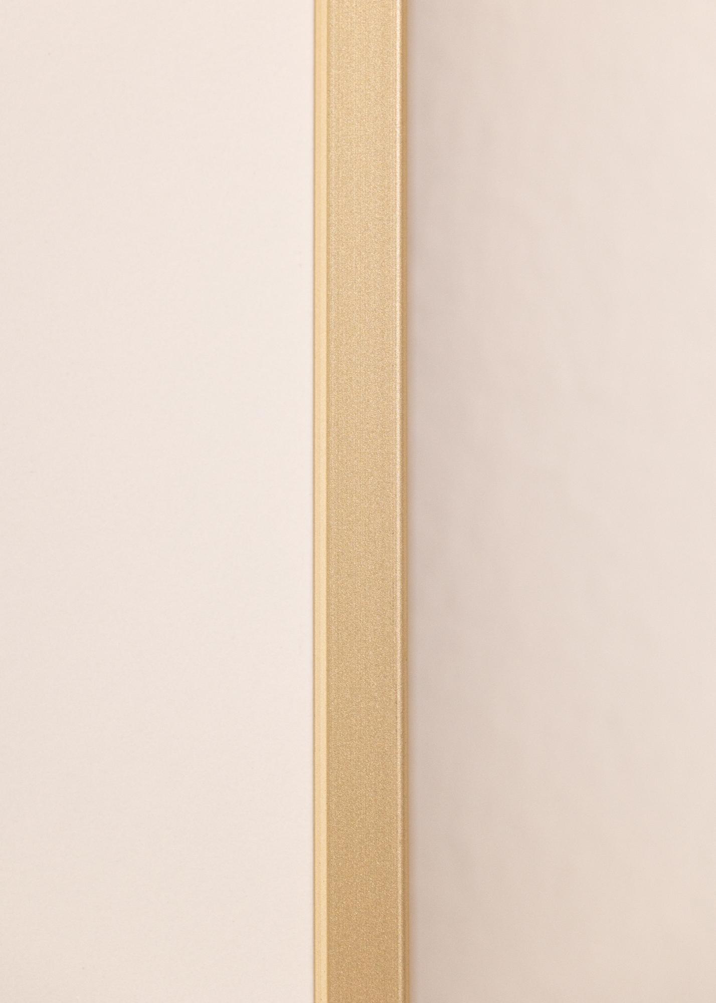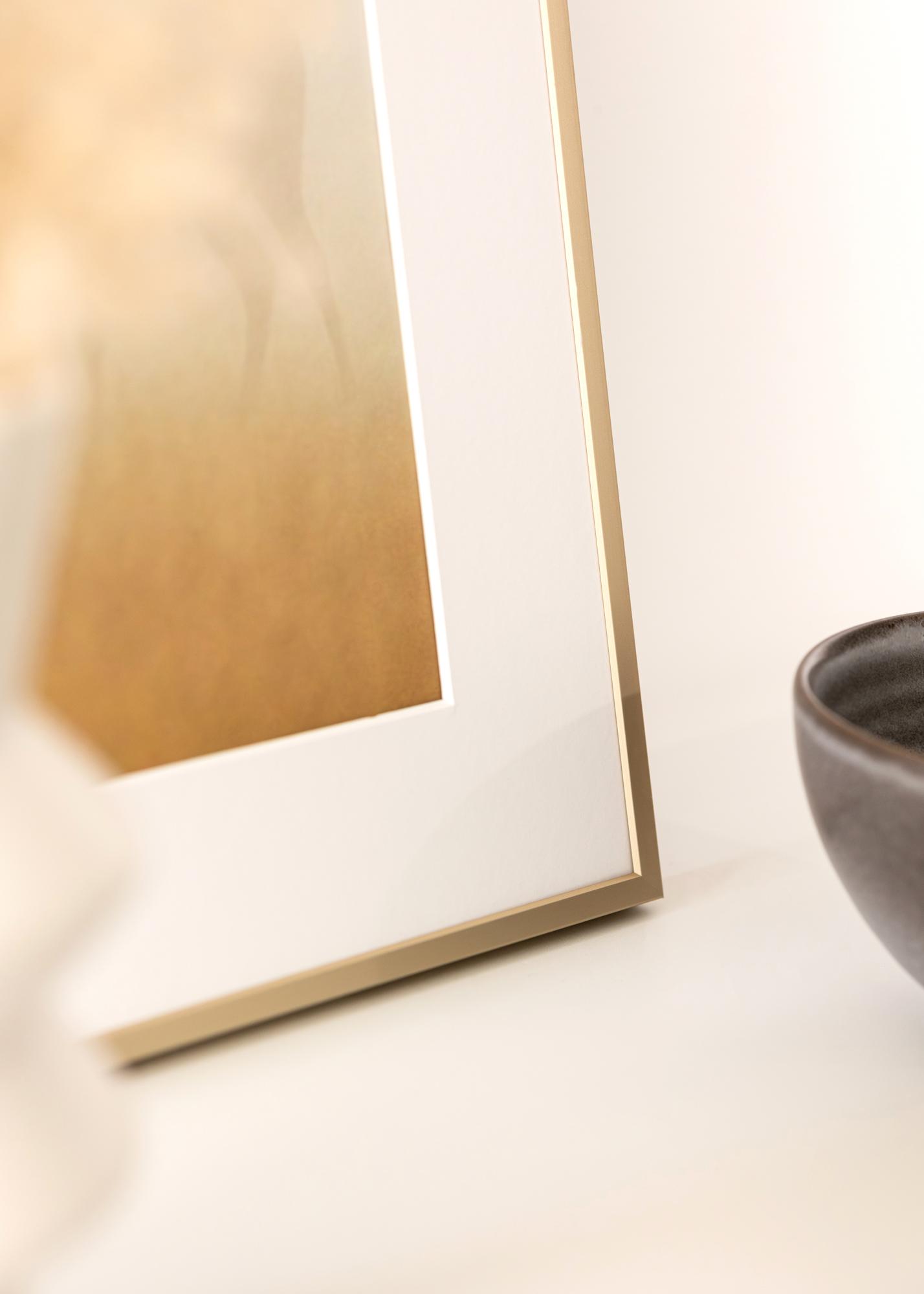Bilderammen er laget av aluminium og har en ramliste som er 7,8 mm bred samt en dybde på 18,6 mm. Den lyse messingtonen glir enkelt inn i de fleste interiørstiler, fra skandinavisk til minimalistisk. De skarpe hjørnene og den glatte finishen bidrar til en elegant følelse som løfter ethvert rom.