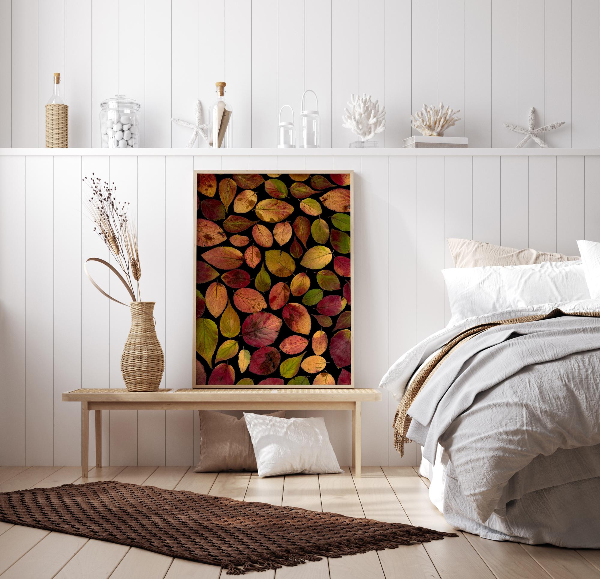 En mønstret plakat av høstløv. En rekke gule, rosa og røde farger hilser øyet i denne organiserte bladsamlingen. Alle bladene passer sammen på en mørk bakgrunn og bringer høstens liv inn i denne plakaten. Perfekt som en fargeklatt på kjøkkenet eller gangen.