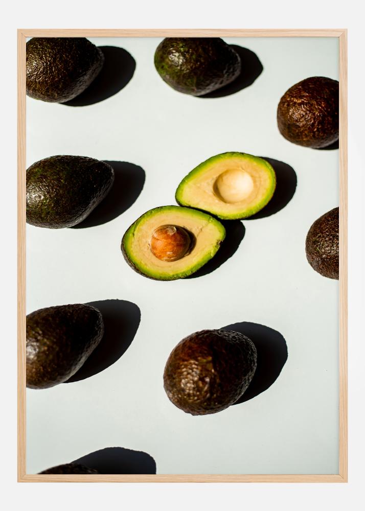 Denne plakaten hyller den enkle skjønnheten hos avokado, en frukt som har blitt et ikon for sunn mat og moderne kjøkkentrender. De mørkegrønne, knudrete skallene av hele avokadoen kontrasterer med den ene halvdelen som er åpen og avslører den myke, lysegrønne innsiden og den blanke, brunaktige kjernen. Dette spillet mellom tekstur og farge gir en leken og samtidig stilren estetikk.