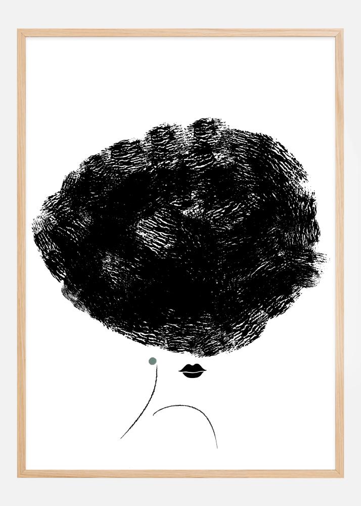 Denne konseptuelle plakaten fremstiller en minimalistisk men uttrykksfull kvinnelig profil, der hennes store, voluminøse hår dominerer scenen. Håret, avbildet med kraftfulle og tykke penselstrøk i svart, skaper en dramatisk kontrast mot den hvite bakgrunnen og gir følelsen av en dynamisk bevegelse fanget i et stille øyeblikk. En liten, diskret grønn prikk, plassert ved øret, bryter av monokromatikken og tilfører en subtil fargeaksent. Dette trykket fremhever det essensielle i form og farge, og tilbyr en dristig, moderne estetikk til ethvert samtidsrom.