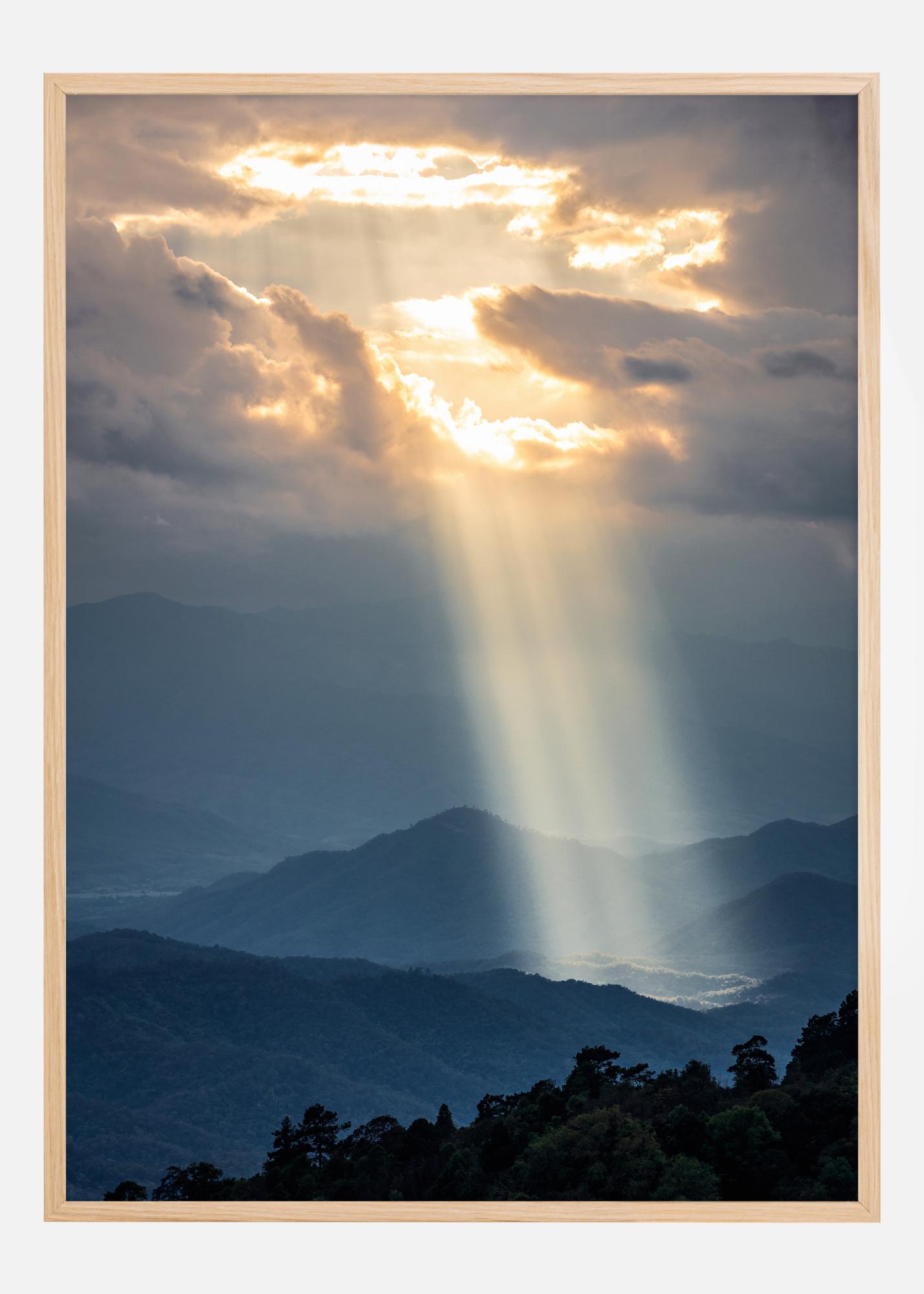 Denne inspirerende posteren avbilder et majestetisk landskap der solstrålene bryter gjennom skyene og belyser de krusende fjellene. Det er en scene som fanger den sublime skjønnheten i naturen, med en dramatisk himmel som står i kontrast til de mykt konturerte fjellene. Skygger og lys leker over landskapet og skaper en sterk følelse av dybde og rom.