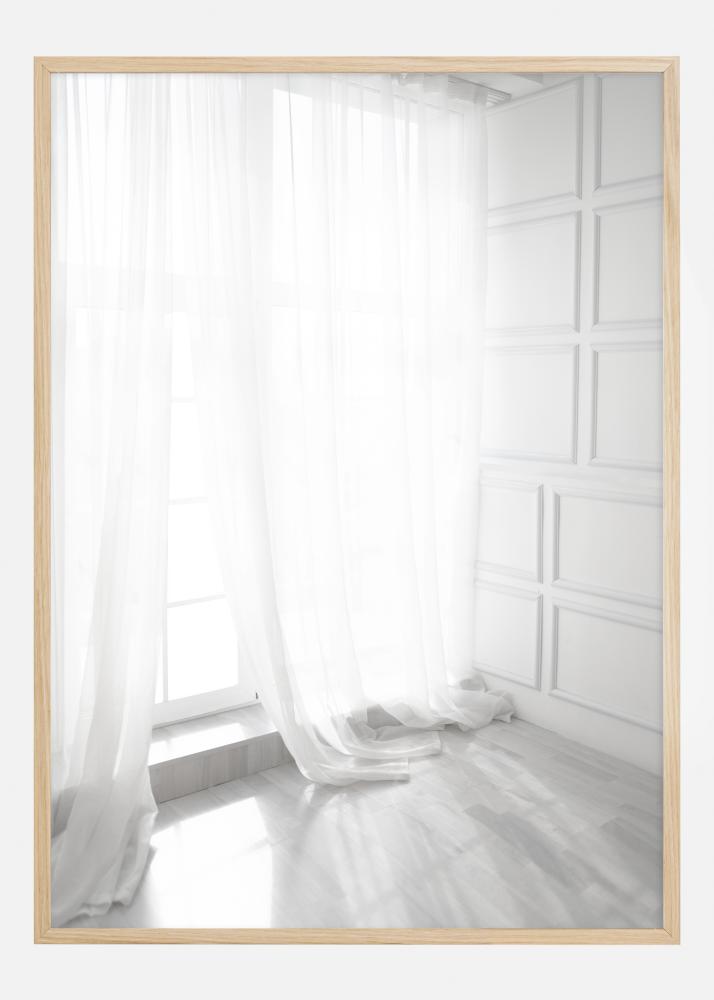 Denne rolige og rensende plakaten forestiller et stille hjørne av et rom drapert med gjennomsiktige hvite gardiner. Lyset som siles gjennom stoffet skaper et spill av skygger og nyanser på det blanke gulvet, hvilket gir en følelse av fredfullhet og klarhet. Dette minimalistiske trykket er et uttrykk for stillhet og ville passe perfekt i et miljø som streber etter enkelhet og ro.