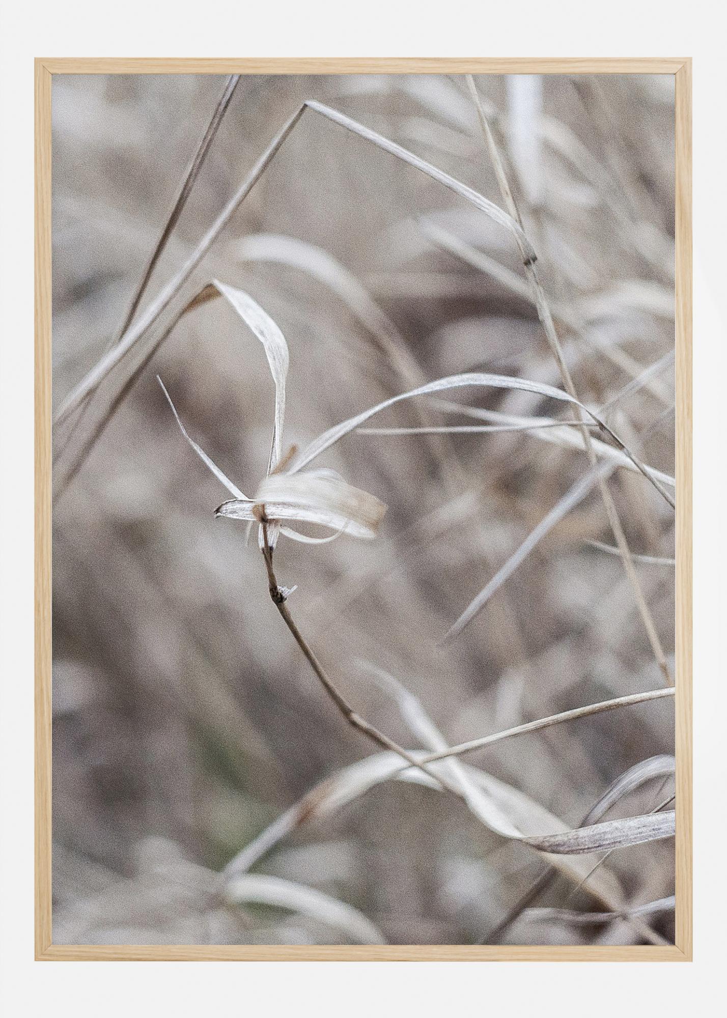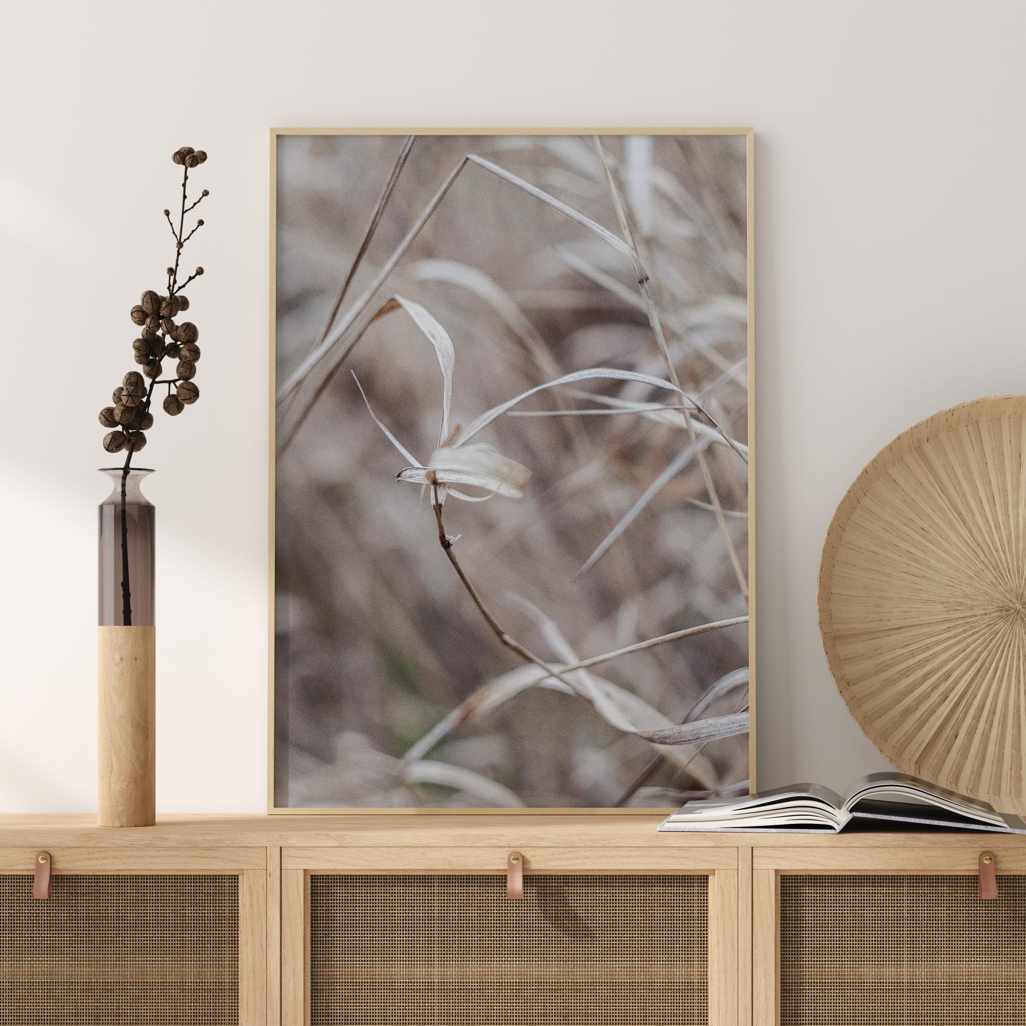 En elegant naturplakat av myke blader i nærbilde. De milde stilkene og bladene fører blikket over stykket. En følelse av dybde blir lagt til med den ufokuserte bakgrunnen. Heng denne plakaten opp på en lys ensfarget vegg, og la de nøytrale pastellfargene virkelig skille seg ut.