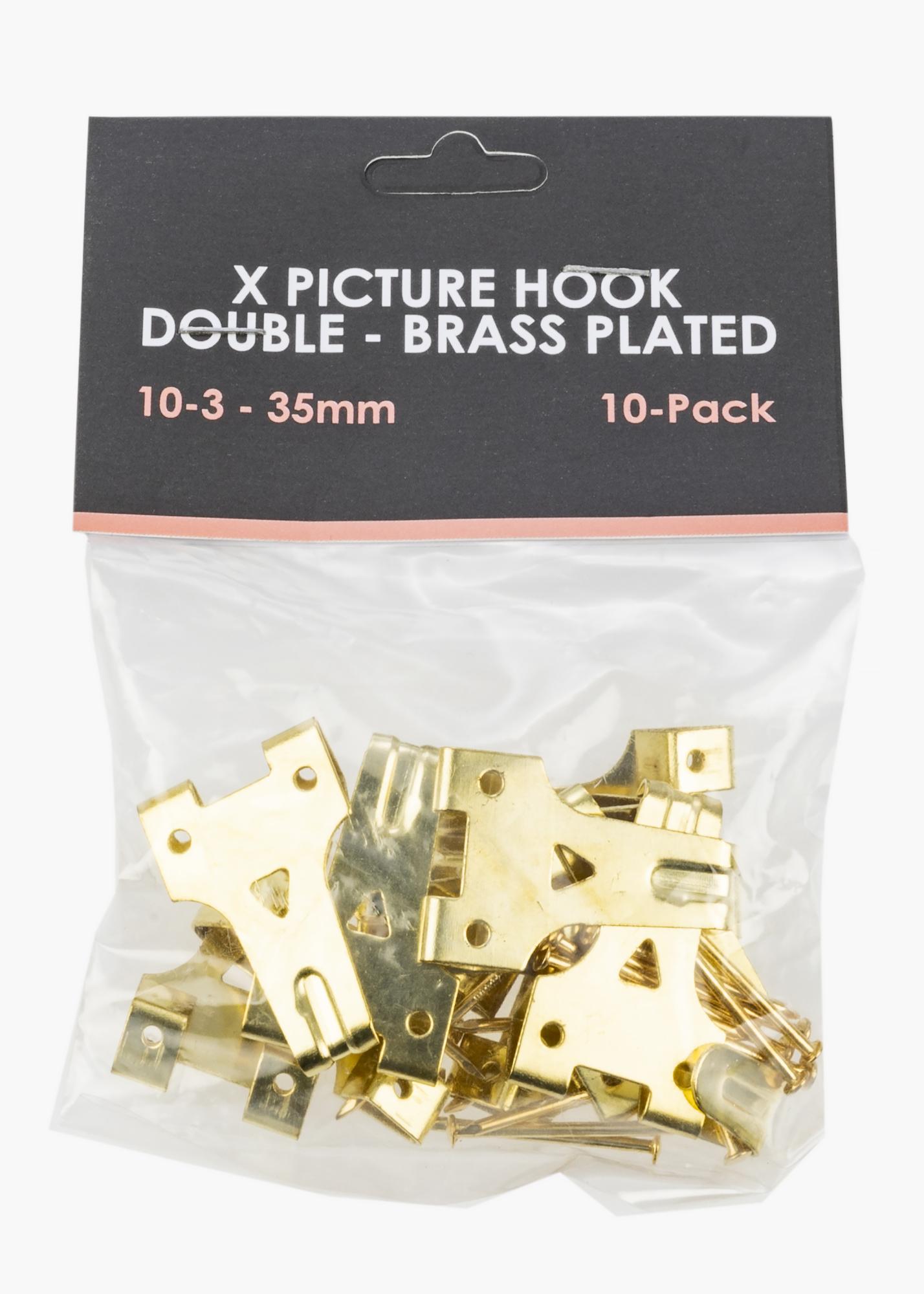 Dobbel X-krok til montering på tre- eller gipsvegg. Tåler belastning på opptil 10 kg. Messingfarget.