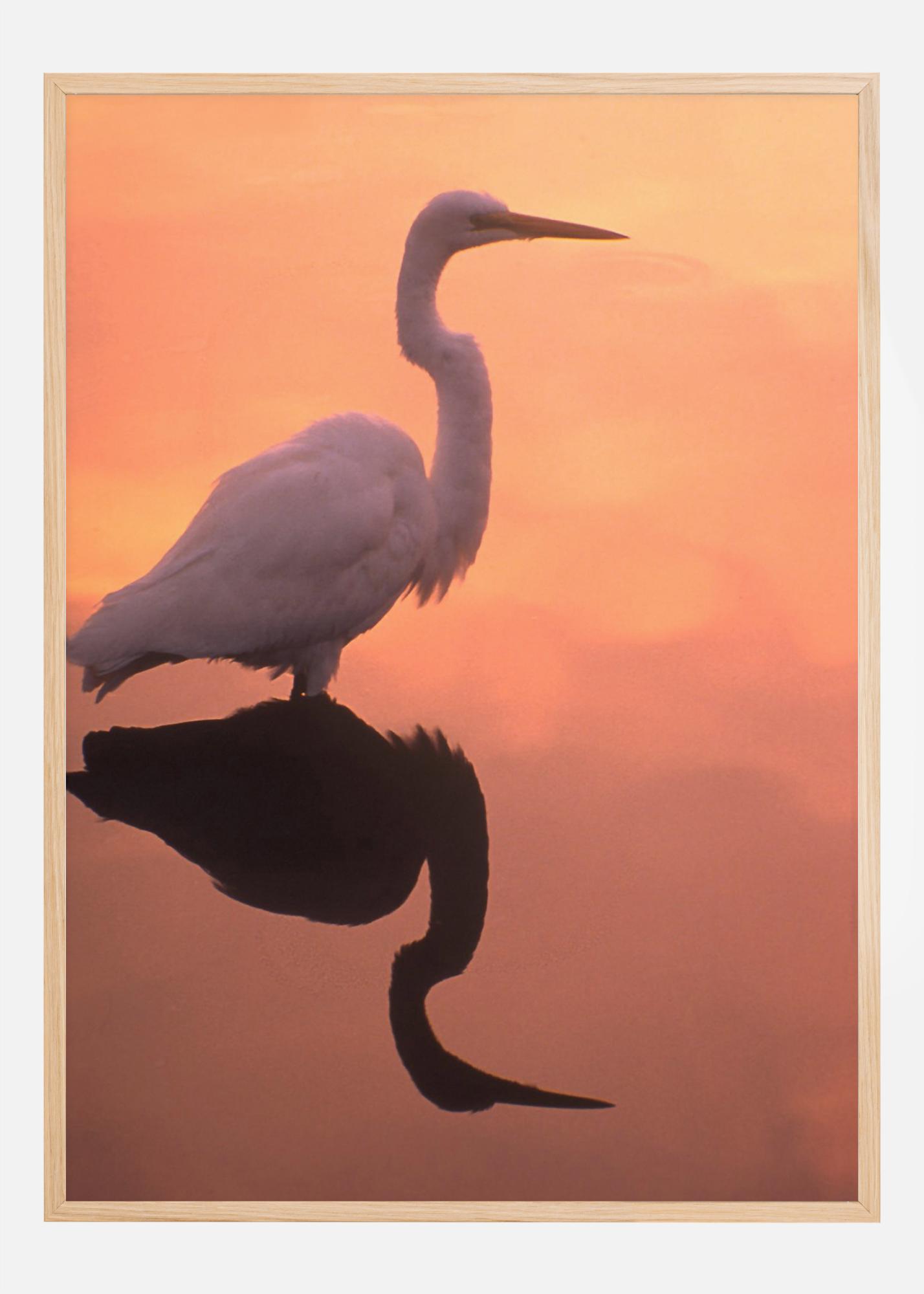 En dyrelivsplakat av en hvit stork mot en fantastisk oransje himmel. Den enkle refleksjonen av storken i vannet viser også et perfekt speilbilde av himmelen. Den myke oransje og gule fargepaletten er perfekt for å tilføre varme og fred til hjemmet ditt.