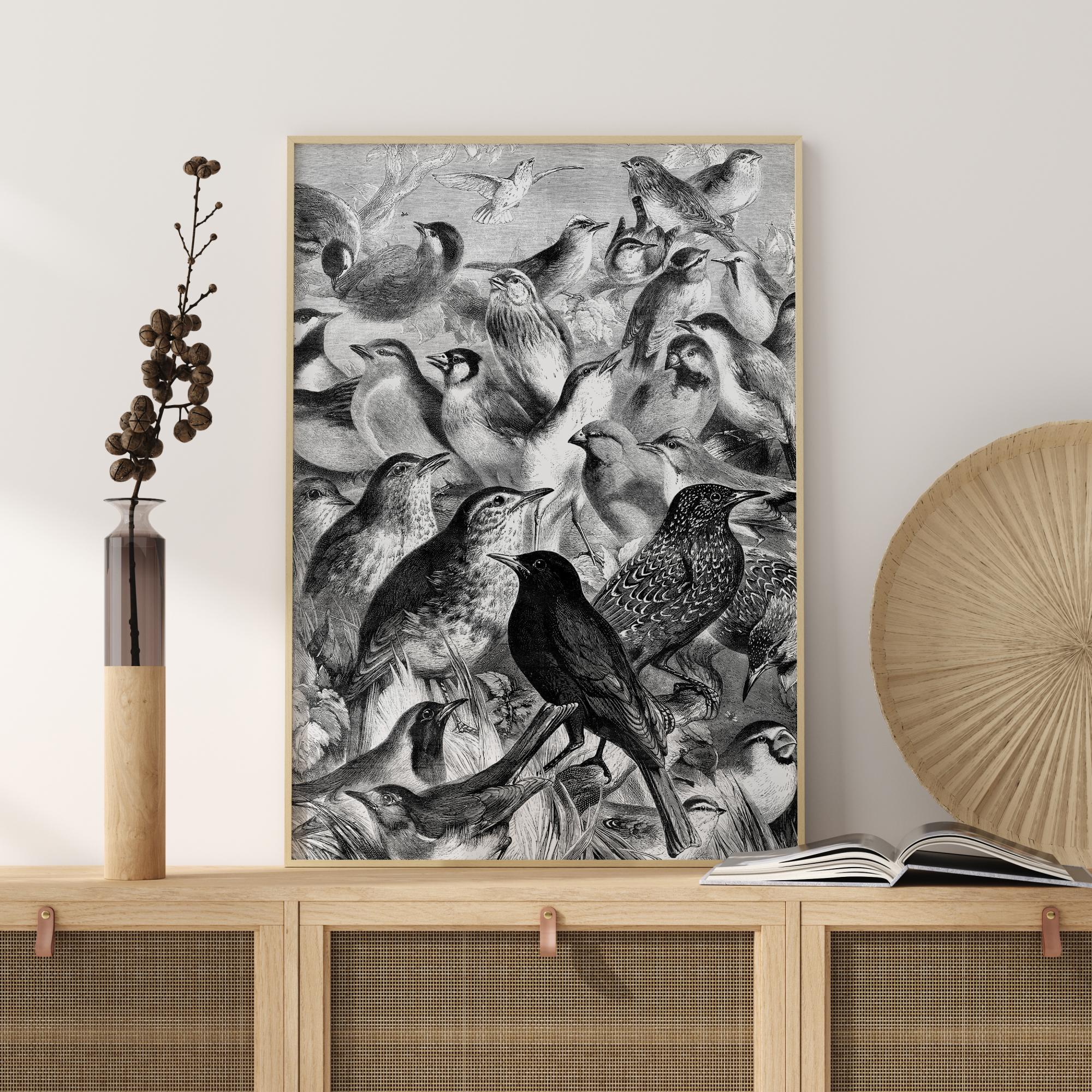 En svart-hvitt-plakat av forskjellige fugler. Lær alt om fugler i denne plakaten med ulike innfødte britiske fugler. Hold deg opptatt mens du oppdager fuglene i bildet og lærer om dem. La dem skille seg ut enda mer mot en lys vegg i ditt hjem.