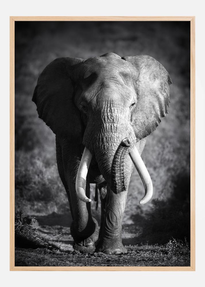 Denne mektige og fengslende plakaten skildrer en elefant i svart-hvitt, noe som fremhever den majestetiske skapningens rynkete hud og store støttenner. Elefantens verdige nærvær fanges i detalj, og dens rolige blikk gir en følelse av visdom og tidløshet. Dette bildet passer perfekt for alle som setter pris på ville dyr og naturens kraftfulle skjønnhet og ønsker å legge til et uttrykksfullt og tankevekkende element til sitt hjem eller kontor.