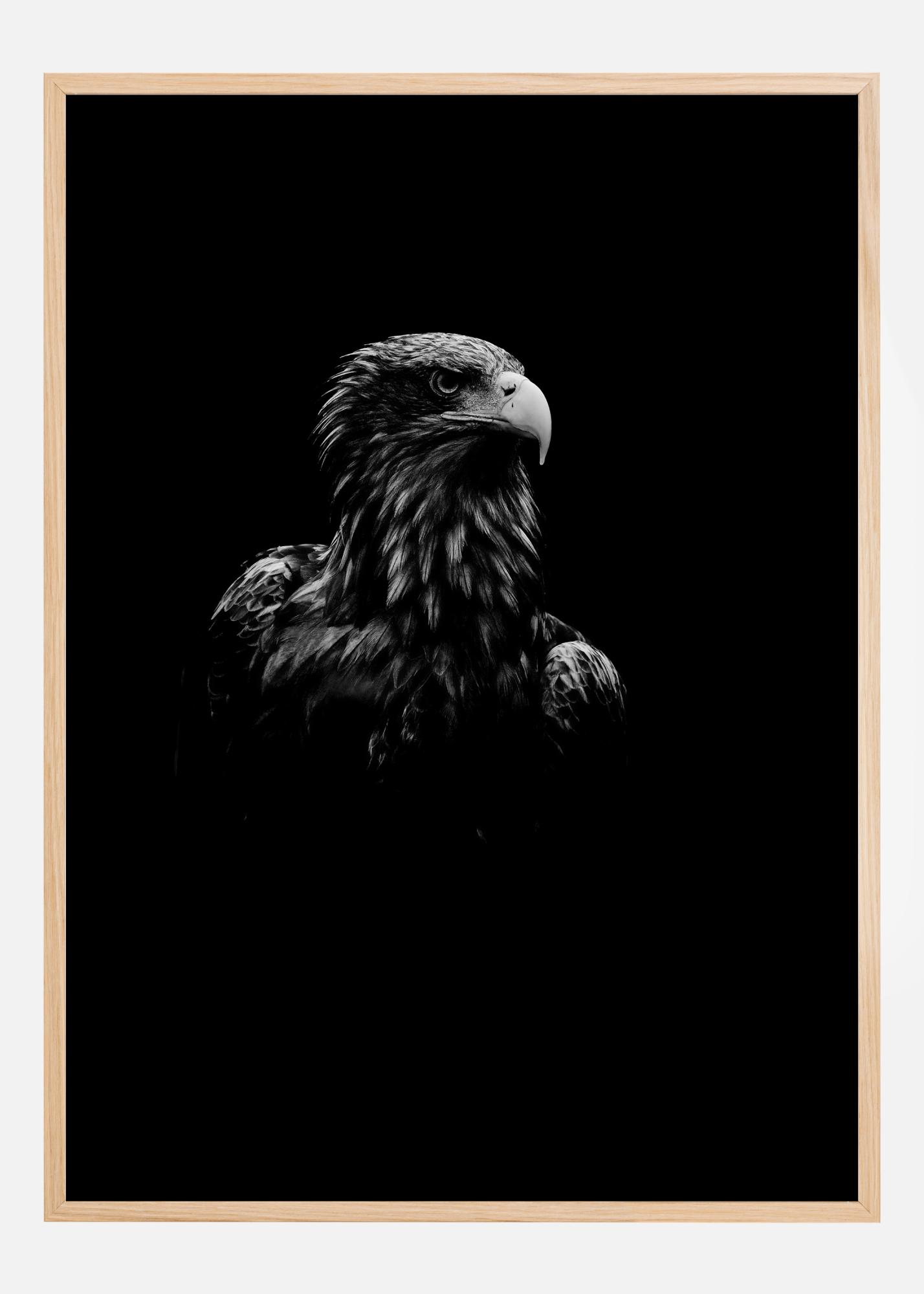 Denne dramatiske plakaten presenterer en mektig ørn, hvis stolte profil og intense blikk fanges mot en mørk bakgrunn. Den kraftfulle avbildningen av ørnen i høy kontrast gir en følelse av styrke og ubendig frihet. Det er et tidløst bilde som taler til oss om verdighet og majestet som naturens rovdyr besitter.