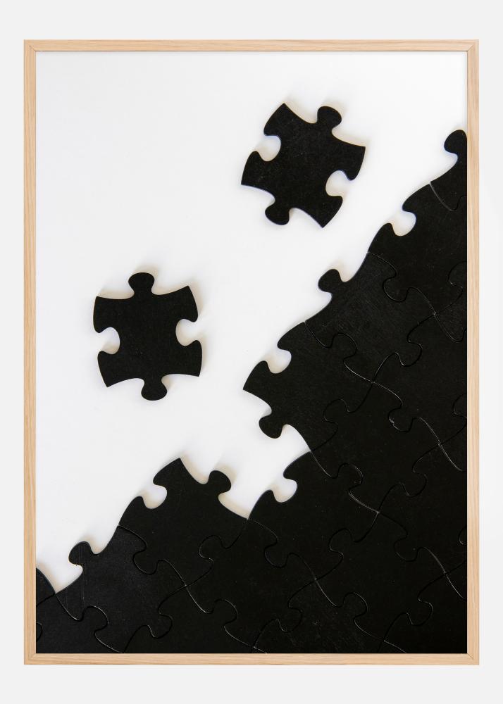 Denne fascinerende posteren med et puslespill i svart-hvitt er en metafor for mysterium, kompleksitet, og gleden ved løsningen. Den leker med ideen om å se hele bildet, der hver enkelt del er avgjørende for det endelige resultatet. Den kreative plasseringen av de svarte puslespillbitene mot den hvite bakgrunnen tilbyr en sterk visuell kontrast og en påminnelse om at selv det som ser ut til å mangle kan skape et interessant bilde.