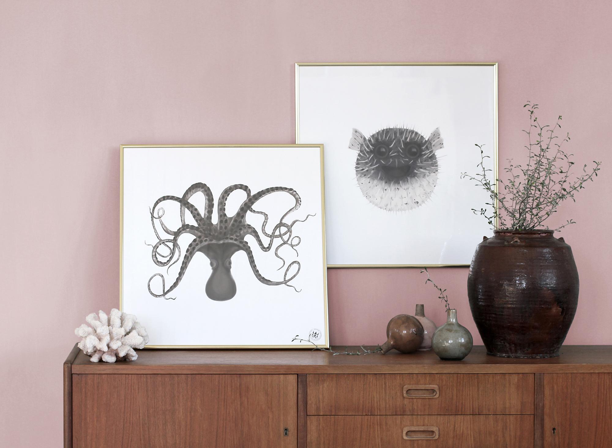 Blekksprut er en heftig plakat der motivet så absolutt fanger interessen til betrakteren. Dette bildet går man ikke forbi uten å legge merke til. Er du på jakt etter detaljen i innredningen som piffer opp og gir mer liv, vil denne plakaten av en blekksprut passe svært godt. Sammen med en fin ramme som matcher rommets øvrige innredning kan den gjerne utgjøre hovedmomentet på en vegg. Den blir like fin om du henger den opp eller om den blir stående på en benk eller på en bildelist.
