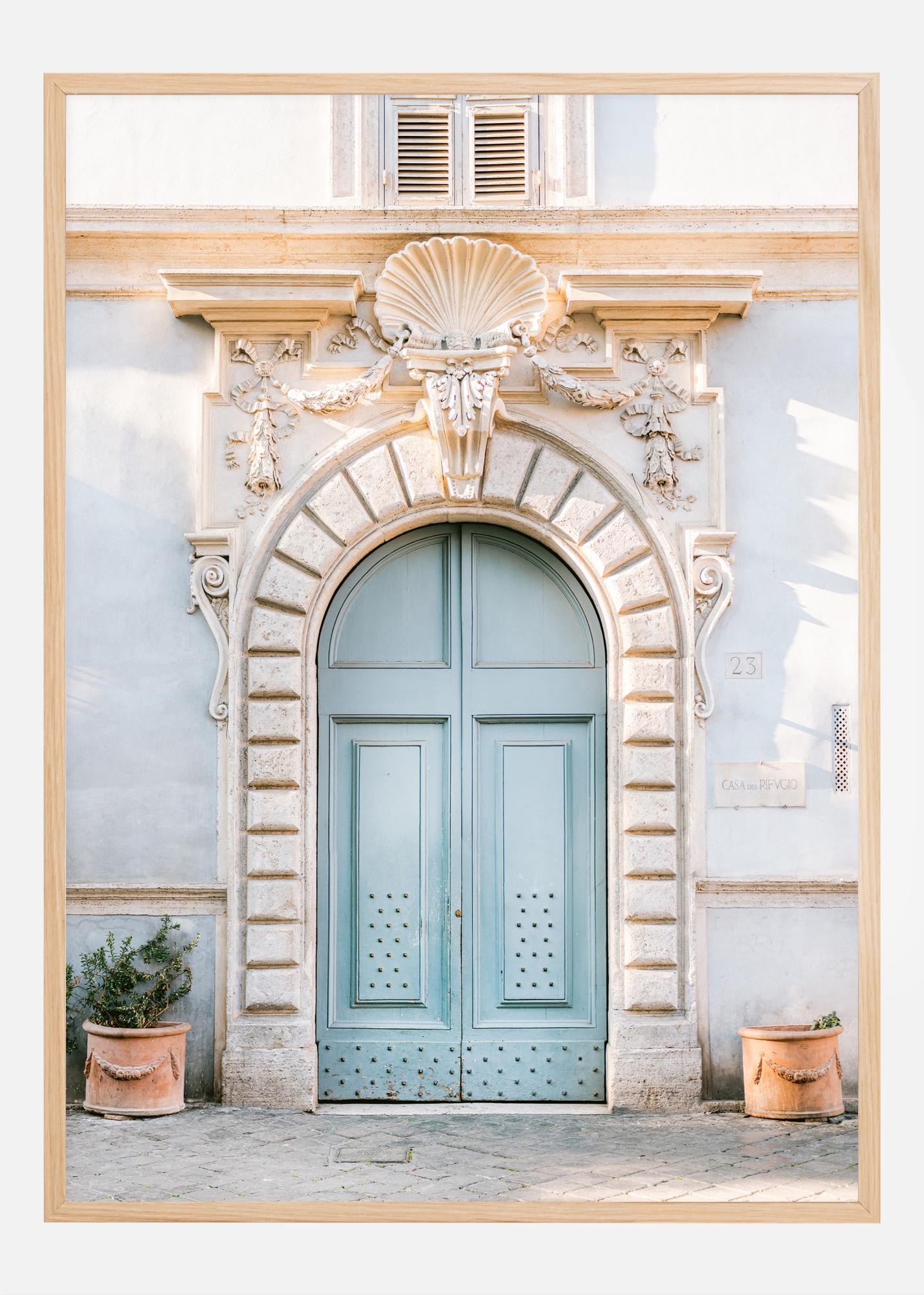 Denne plakaten fanger skjønnheten og sjarmen ved en klassisk europeisk arkitektur. Den lyseblå dobbeldøren er omgitt av en elegant steinportal, med fint utskårne detaljer og ornamenteringer som gir en følelse av historisk rikdom og kulturell arv. Over døren sitter en imponerende skjellformet bue som fullender denne storslåtte inngangen. På hver side av døren finnes potter med grønne planter, noe som tilfører en naturlig og livlig kontrast til den steinete fasaden. Dette bildet utstråler en rolig og opphøyet stemning, perfekt for å tilføre et element av klassisk skjønnhet i ethvert hjem.